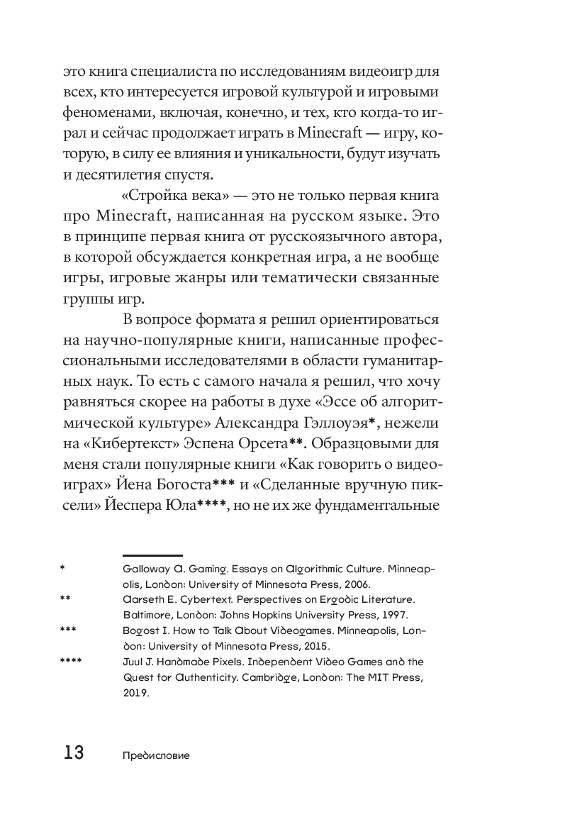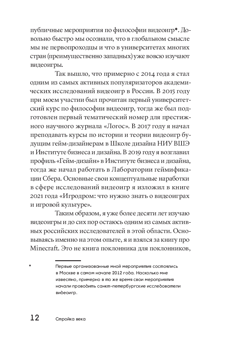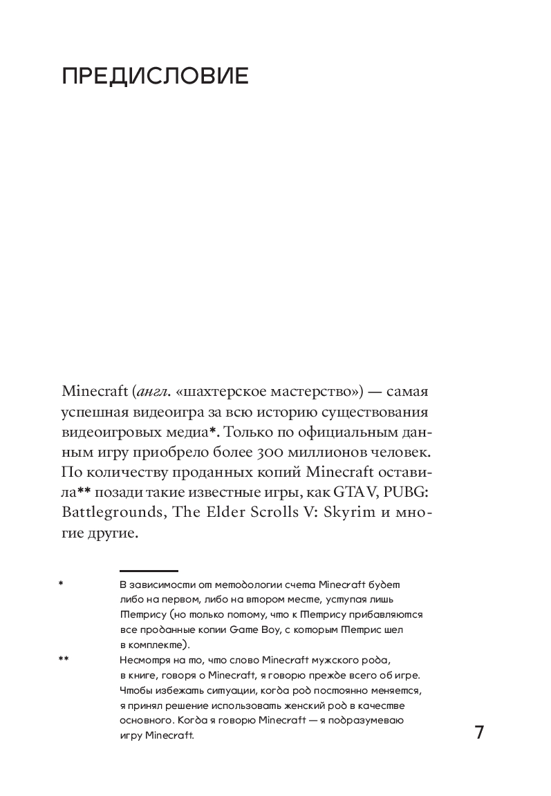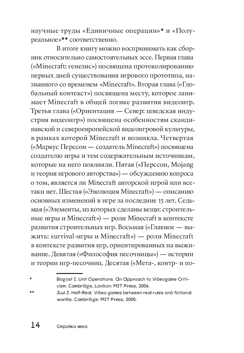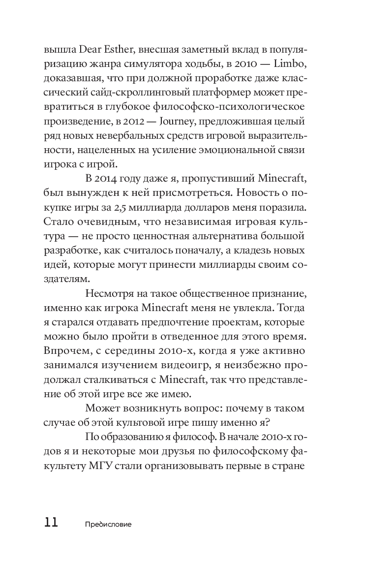 Minecraft делит историю видеоигр на до и после. Уже как минимум одно поколение выросло под лучами квадратного солнца, на сражениях с криперами и эндерменами, поездках на свинье и путешествиях в Нижний мир. В кубическо-пиксельной вселенной – открытом мире без определенных правил и с безграничным количеством возможностей – стримеры собирают миллионы зрителей, музыканты снимают клипы, дизайнеры устраивают модные показы; на отдельном сервере помещается библиотека запрещенной авторитарными режимами литературы, а на других тысячи волонтеров создают точную копию планеты Земля. При этом книг об устройстве, истории и культурном значении этого необъятного и постоянно развивающегося шведского изобретения до сих пор не существовало. Перед вами – первая. Философ и исследователь видеоигр Александр Ветушинский отталкивается от рассказа о сотворении мира Minecraft в контексте эволюции видеоигр, чтобы обнаружить повод для глубокого разговора об игровых практиках как о форме человеческого стремления к творчеству и свободе.