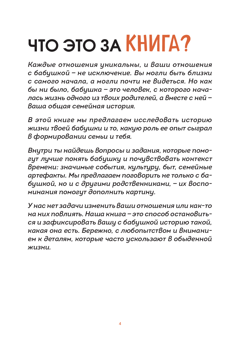 Это больше, чем просто книга. Это ваша семейная реликвия. Подарите себе и бабушке часы доверительных разговоров, смеха и теплых воспоминаний. Пусть ваша история будет наполнена любовью!