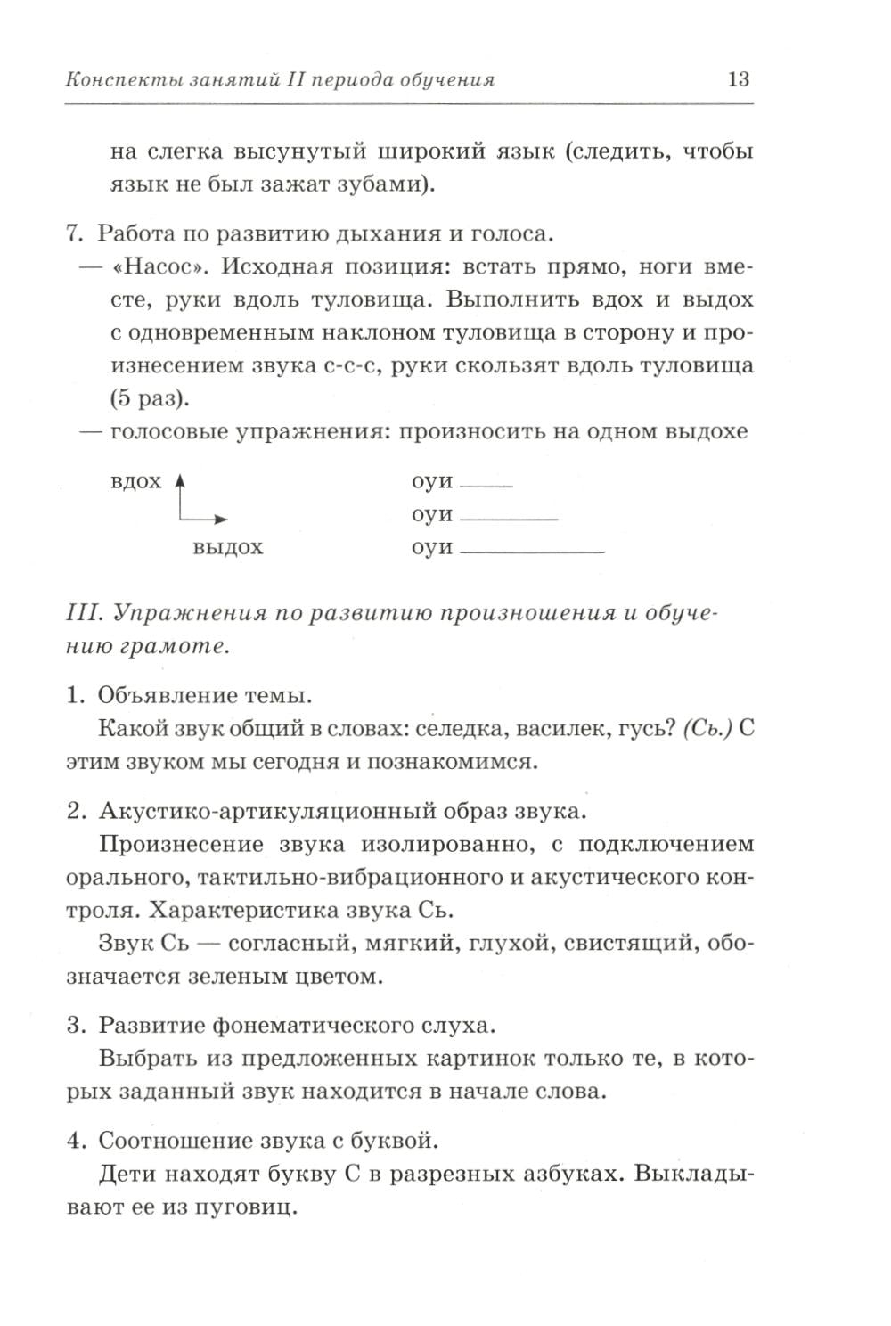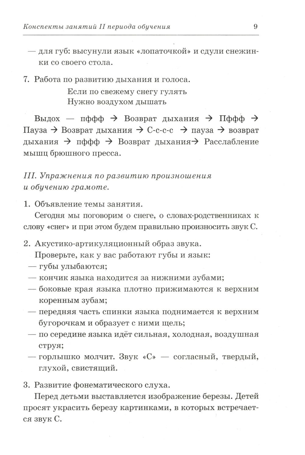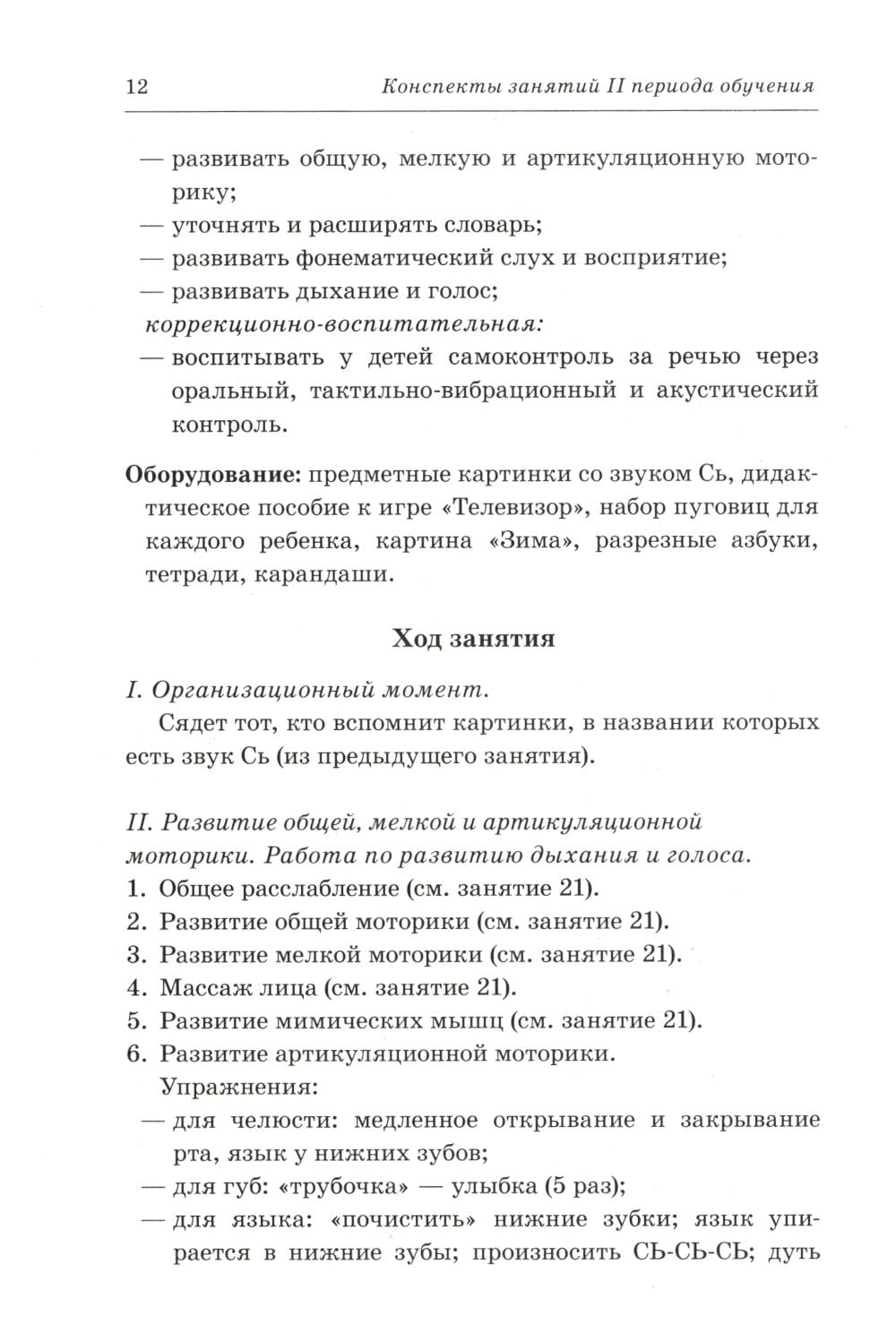 Каждое занятие комплексное, проводится на материале одной лексической темы и содержит подобранные по степени возрастающей сложности упражнения для развития общей, артикуляционной и мелкой моторики, речевого дыхания, голоса, произношения и обучения детей грамоте.