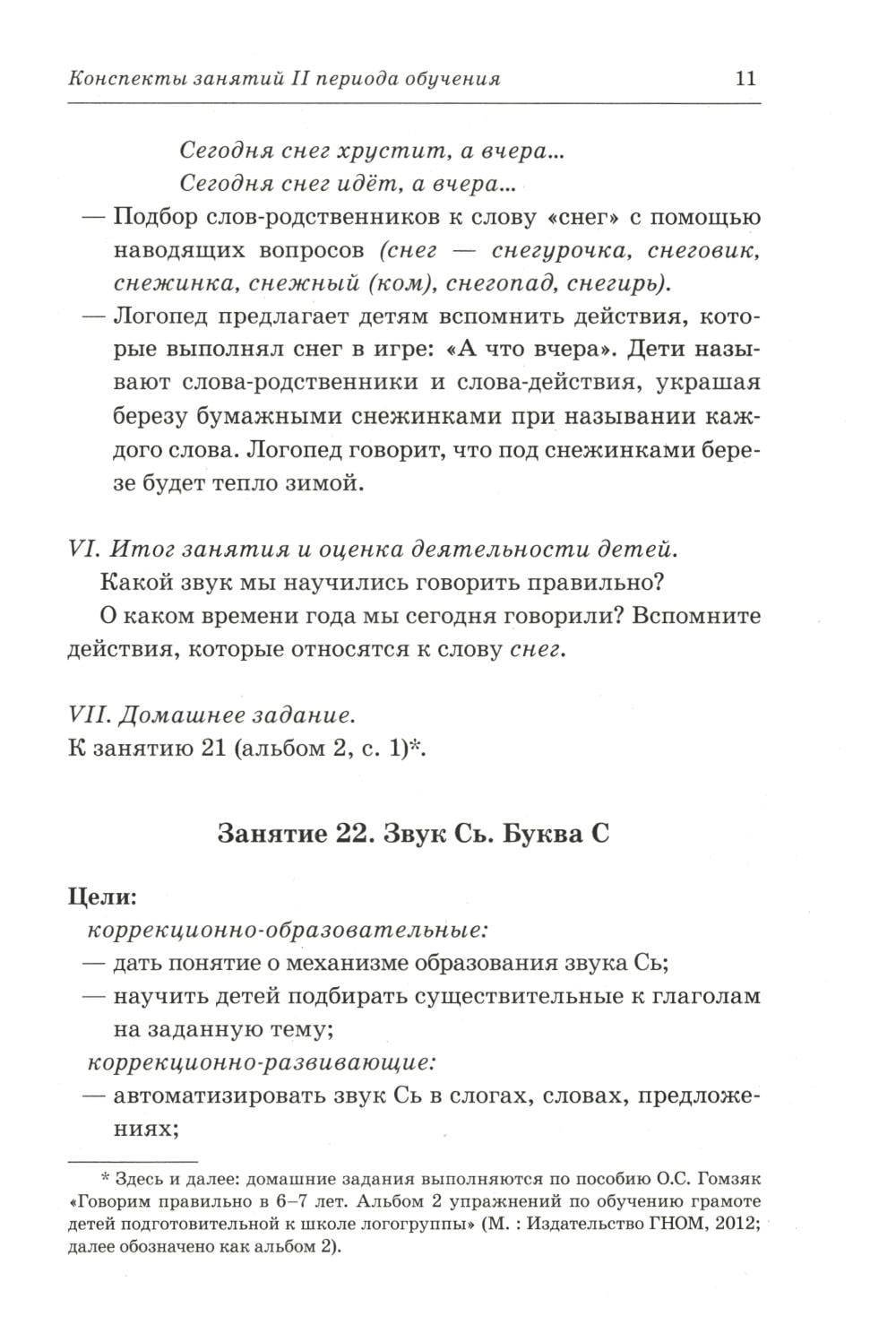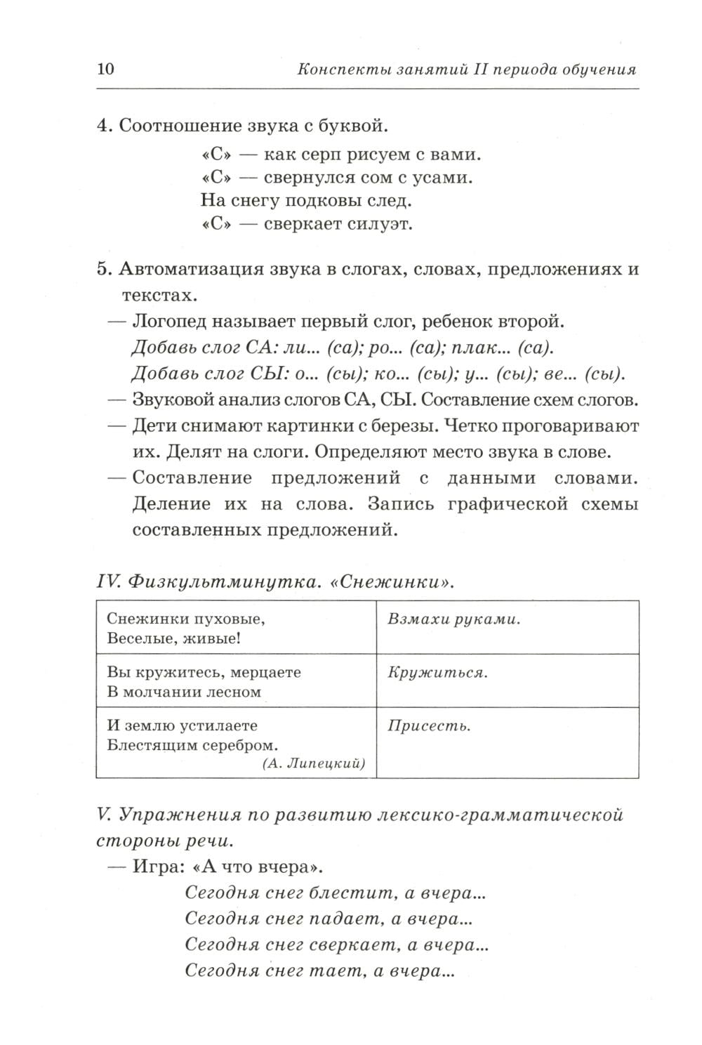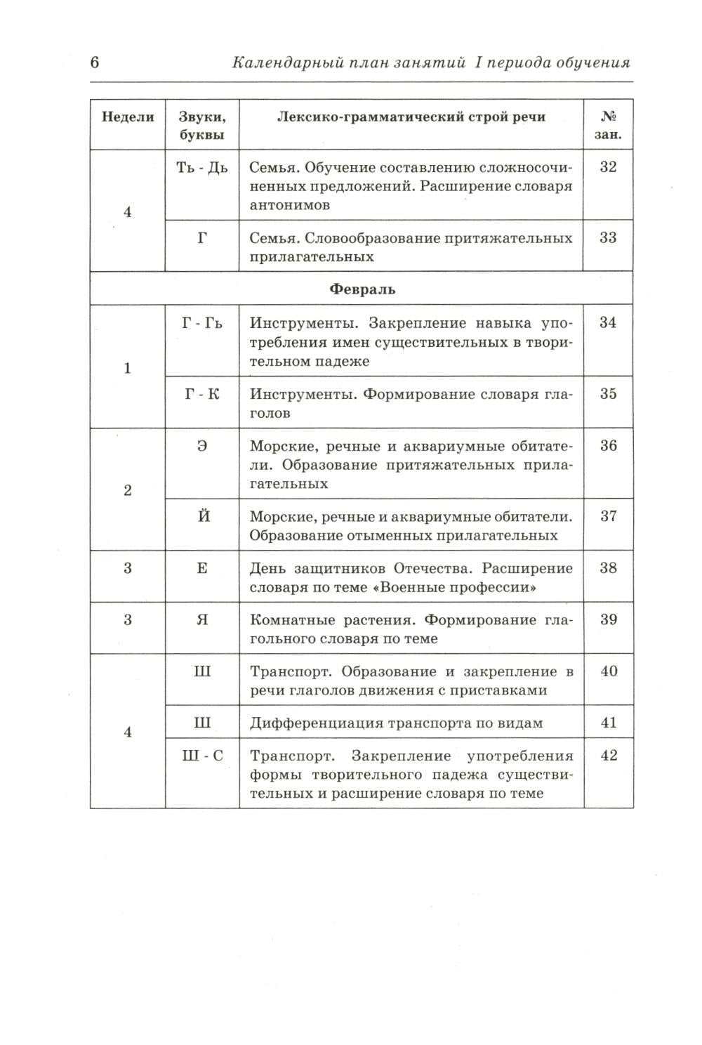 Каждое занятие комплексное, проводится на материале одной лексической темы и содержит подобранные по степени возрастающей сложности упражнения для развития общей, артикуляционной и мелкой моторики, речевого дыхания, голоса, произношения и обучения детей грамоте.