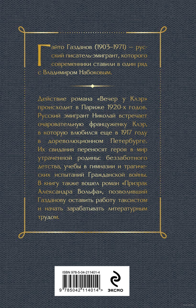 Действие романа "Вечер у Клэр" происходит в Париже 1920-х годов. Русские эмигрант Николай встречает очаровательную француженку Клэр, в которую влюбился еще в 1917 году в дореволюционном Петербурге. Их свидания переносят героя в мир утраченной родины: беззаботного детства, учебы в гимназии и трагических испытаний Гражданской войны.