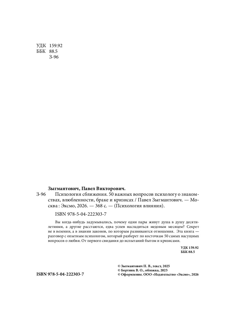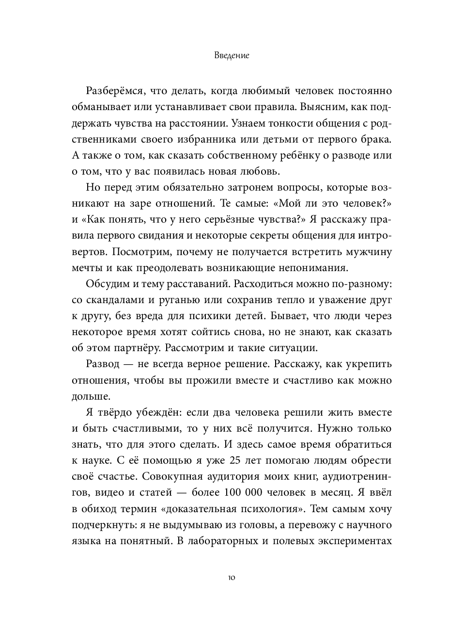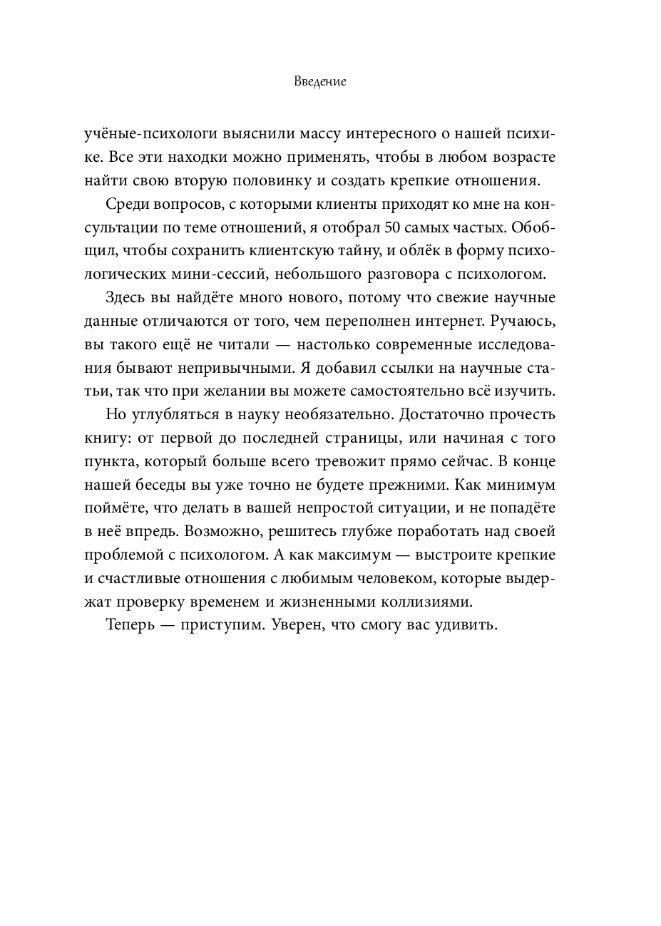Эта книга – разговор с опытным психологом, который разберет по косточкам 50 самых насущных вопросов о любви. От первого свидания до испытаний бытом и кризисами. Павел Зыгмантович – семейный психолог с 25-летним стажем, его книги и статьи ежемесячно читают более 100 000 человек. А свой брак он заключил… трижды с одной и той же женщиной. И вместе они с 2003 года.