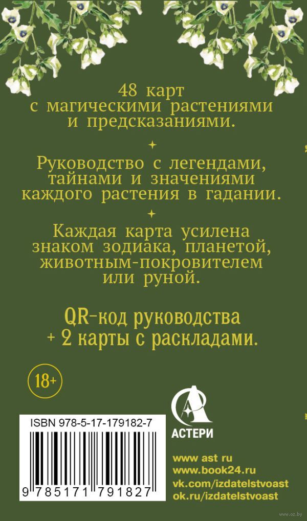 В колоде 48 карт – от знакомых всем целебных трав до скрывающих тайны цветов. Каждое растение хранит свою историю и энергию. Подробное руководство (доступное по QR-коду) проведет вас по ним и объяснит значения карт в гадании.