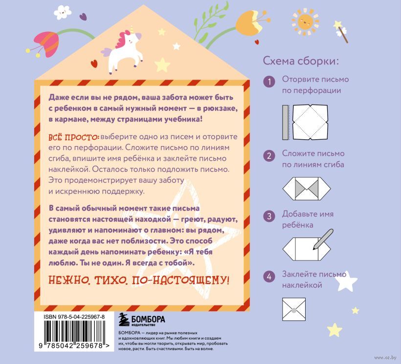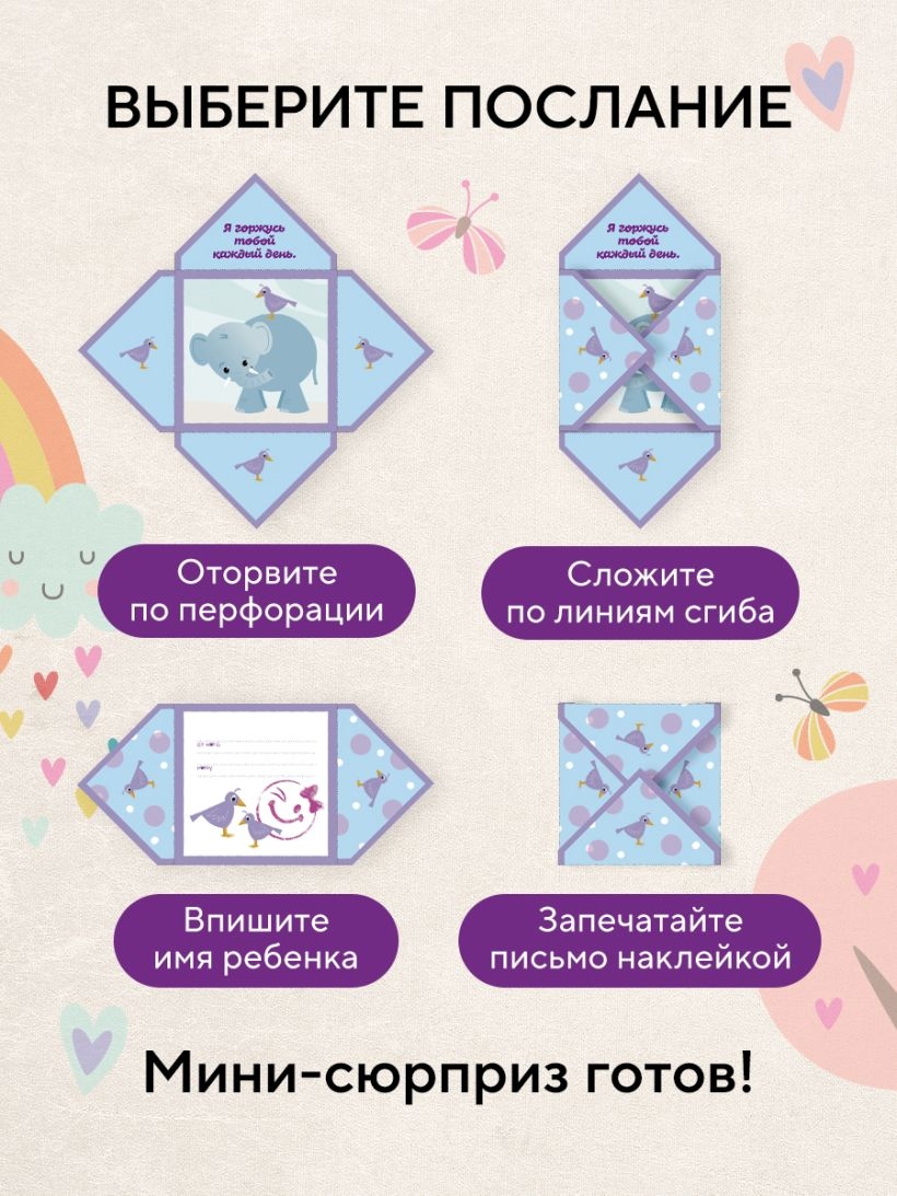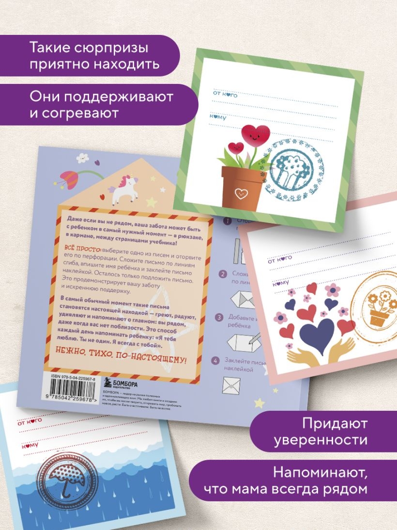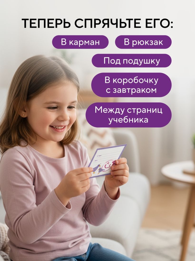 Даже если вы не рядом, ваша забота может быть с ребенком в самый нужный момент – в рюкзаке, в кармане, между страницами учебника! Эти нежные послания от родителя к ребенку можно вручить не словами, а жестом. Эти маленькие письма становятся мостиком между вами – в саду, в школе, в поездке, в дни, когда нет возможности обнять. На каждой карточке – теплое начало, фраза поддержки или нежное напоминание. Вам остается только добавить личное – пару строк от себя. Про то, как скучаете. Про то, как верите. Про то, как гордитесь.
