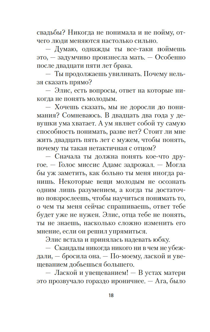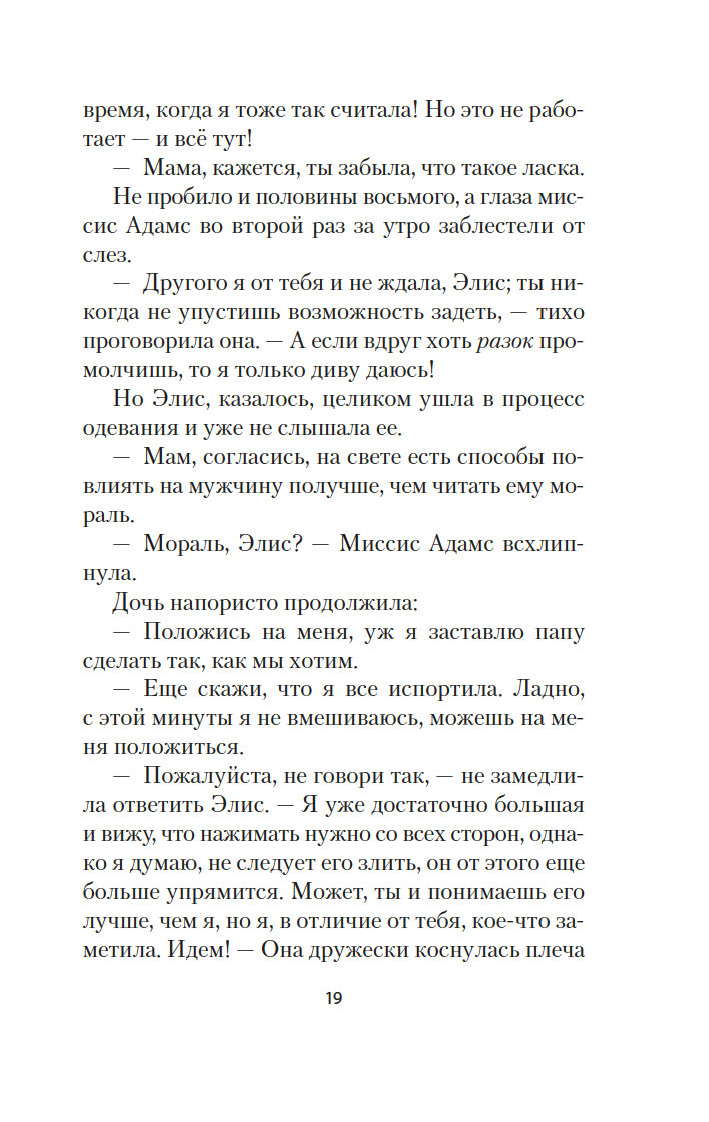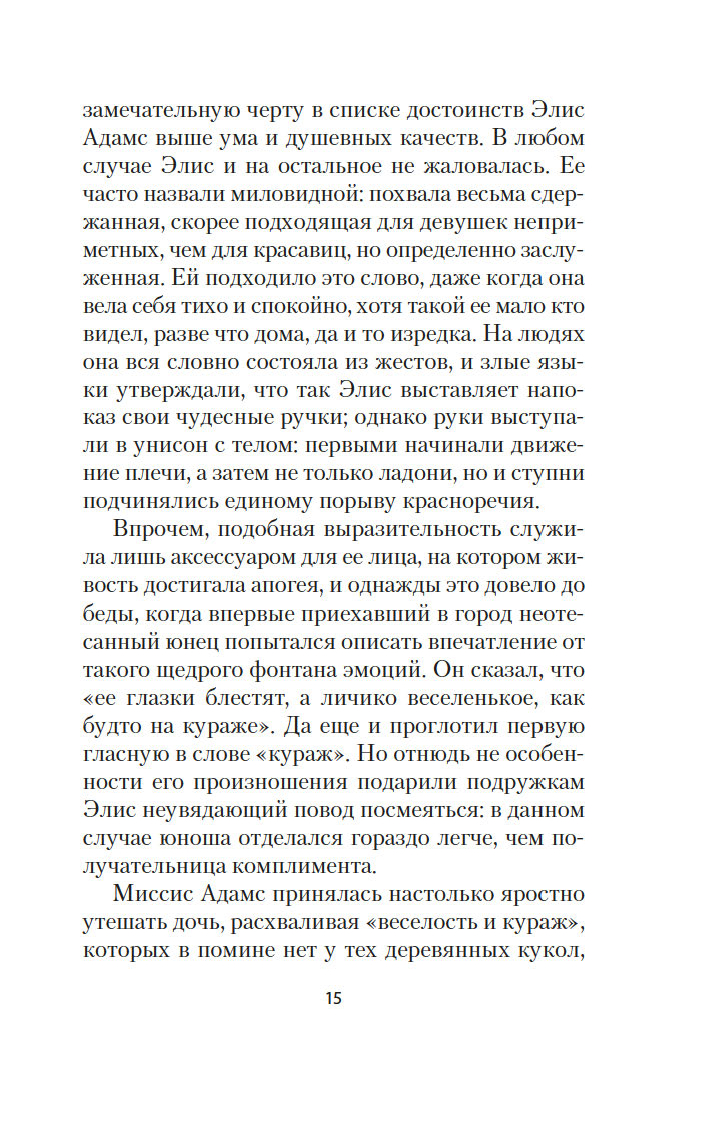 Роман "Элис Адамс" принес его автору, Буту Таркингтону, Пулитцеровскую премию (вторую по счету, первого Пулитцера Таркингтон получил за роман "Великолепные Эмберсоны"). Это изящная история любви и разочарования, история о том, как легкомысленная девушка приходит к познанию истинных ценностей и приятию мира таким, какой он есть.