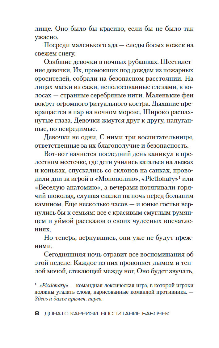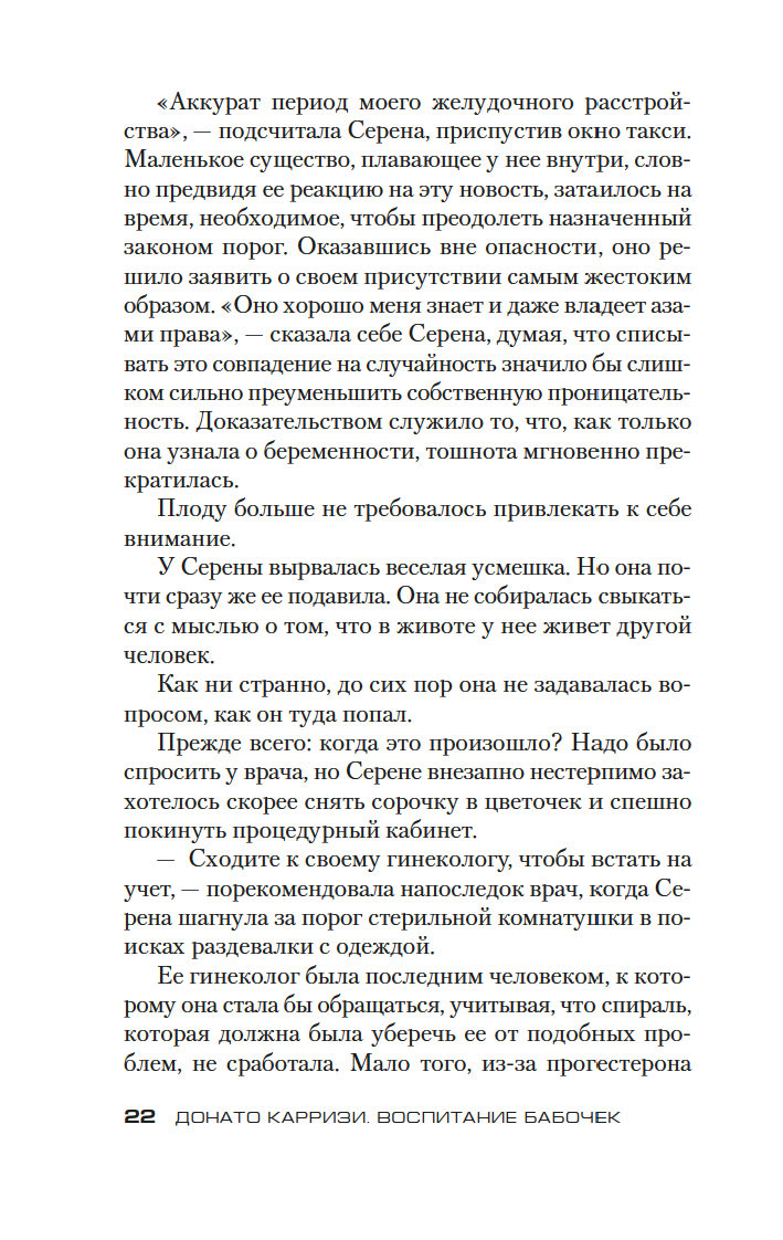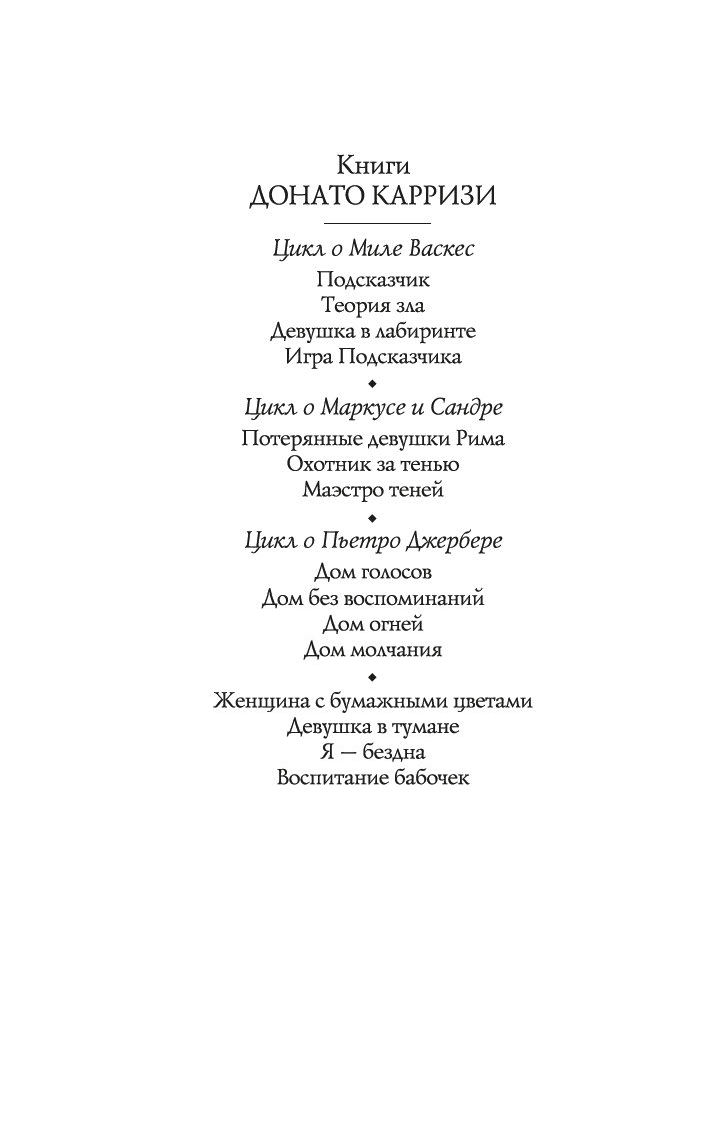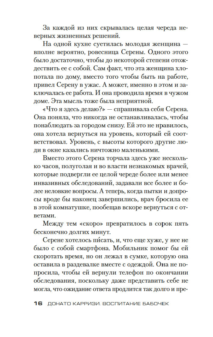 Донато Карризи – известный итальянский писатель, драматург и сценарист, в прошлом адвокат, специалист в области криминалистики и поведенческих наук, лауреат итальянской премии Bancarella (2009), французской премии Prix SNCF du polar (2011) и других, автор бестселлеров, переведенных на 40 с лишним языков и разошедшихся общим тиражом более 20 миллионов экземпляров. Его новый роман "Воспитание бабочек", только в Италии уже проданный тиражом более 220 тысяч экземпляров, – жуткая, гипнотическая история странствия одной женщины, отправившейся на поиски пропавшего ребенка. Бесконечное погружение в самые страшные, самые тайные закоулки человеческой души. Где живет любовь. Где гнездятся страхи. Где таятся чудовища.