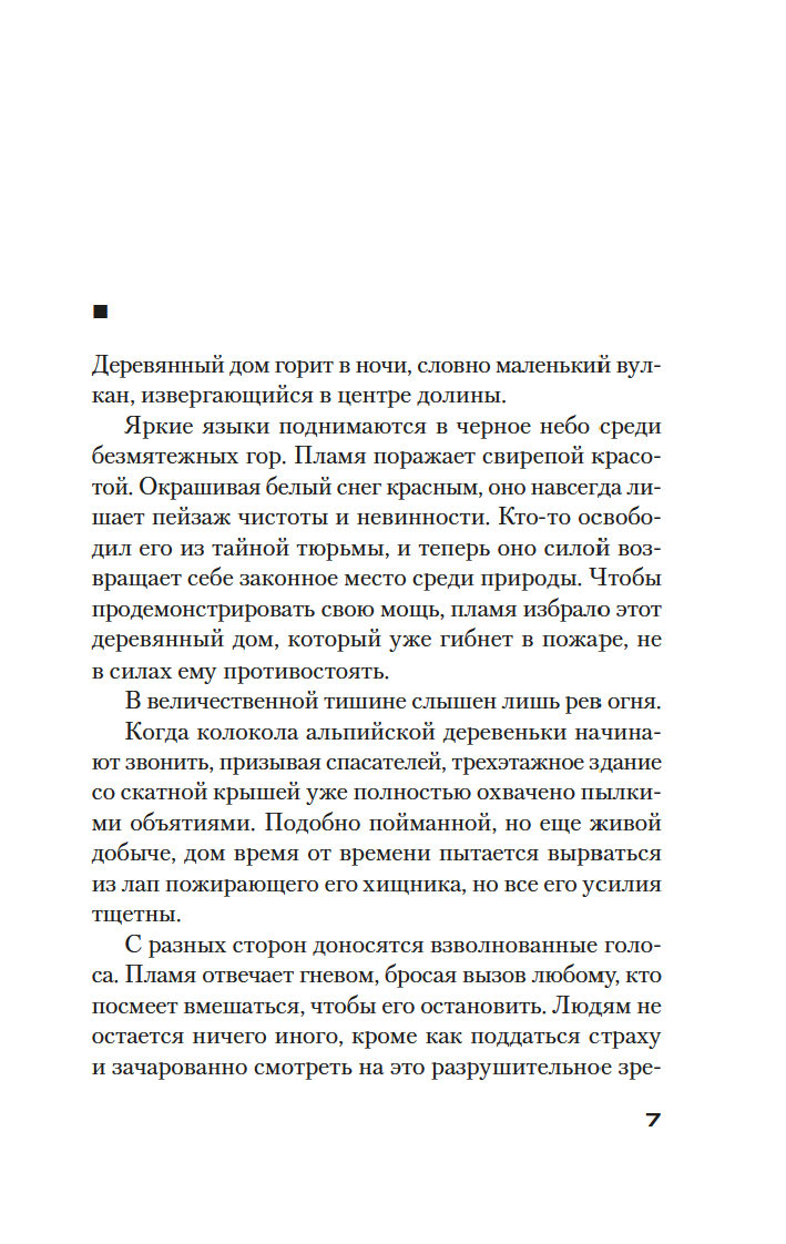 "Деревянный дом горит в ночи, словно маленький вулкан, извергающийся в центре долины. Яркие языки поднимаются в черное небо среди безмятежных гор... И в одно мгновение все рушится".