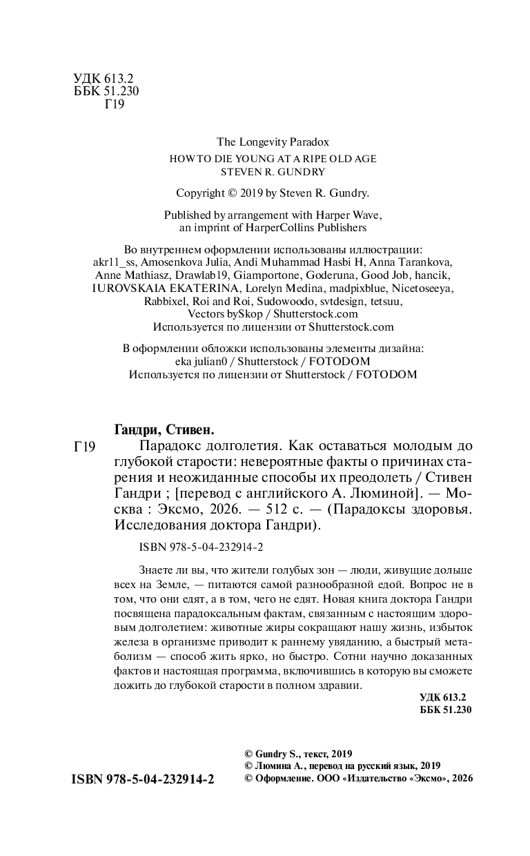 Знаете ли вы, что жители голубых зон – люди, живущие дольше всех на Земле – питаются самой разнообразной едой. Вопрос не в том, что они едят, а в том, чего не едят. Новая книга доктора Гандри посвящена парадоксальным фактам, связанным с настоящим здоровым долголетием: животные жиры сокращают нашу жизнь, избыток железа в организме приводит к раннему увяданию, а быстрый метаболизм – способ жить ярко, но быстро. Сотни научно доказанных фактов и настоящая программа, включившись в которую вы сможете дожить до глубокой старости в полном здравии.