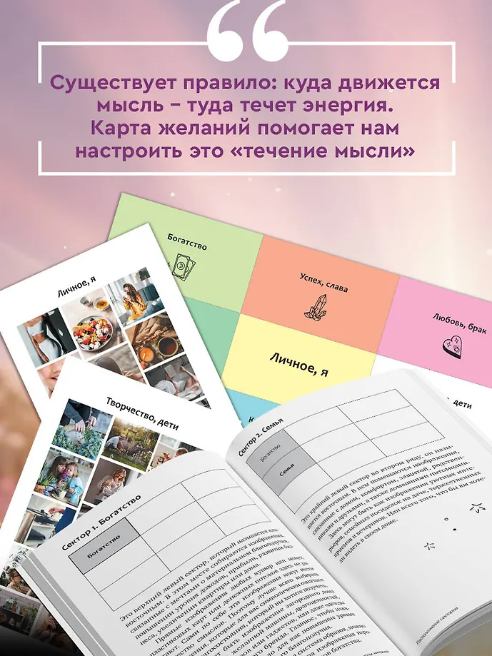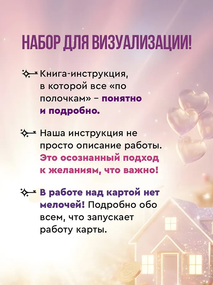 Карта желаний для женщин – готовый набор для визуализации будущего, о котором ты мечтаешь! Это не волшебная палочка, а осознанный метод работы с целями и желаниями. Этот набор с книгой-инструкцией научит правильно осознавать свои желания, формулировать их, визуализировать и, как результат, видеть пути их реализации. Техника карты желаний поможет сфокусировать позитивную энергию и привлечь в жизнь желанные перемены.