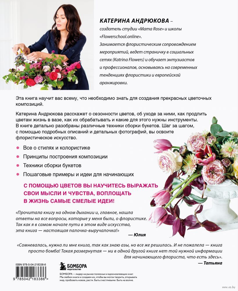 Катерина Андрюкова расскажет о сезонности цветов, об уходе за ними, как продлить цветам жизнь в вазе, как их обрабатывать и какие для этого нужны инструменты. В книге детально разобраны различные техники сборки букетов. Шаг за шагом, с помощью подробных описаний и детальных фотографий, вы освоите флористическое искусство.