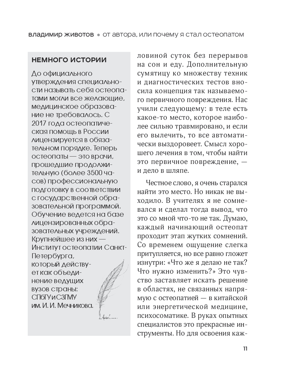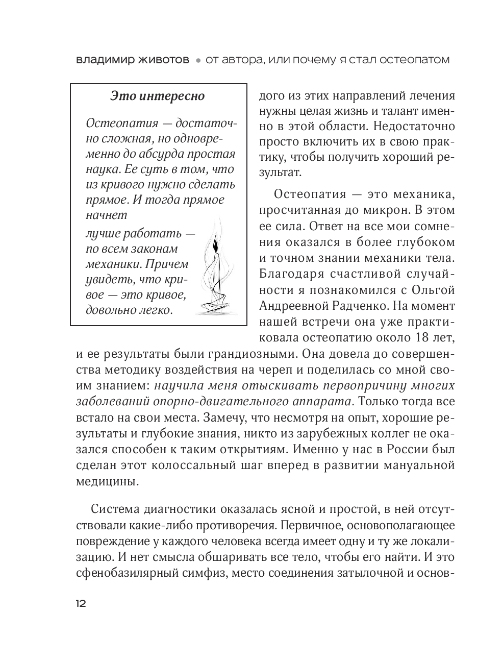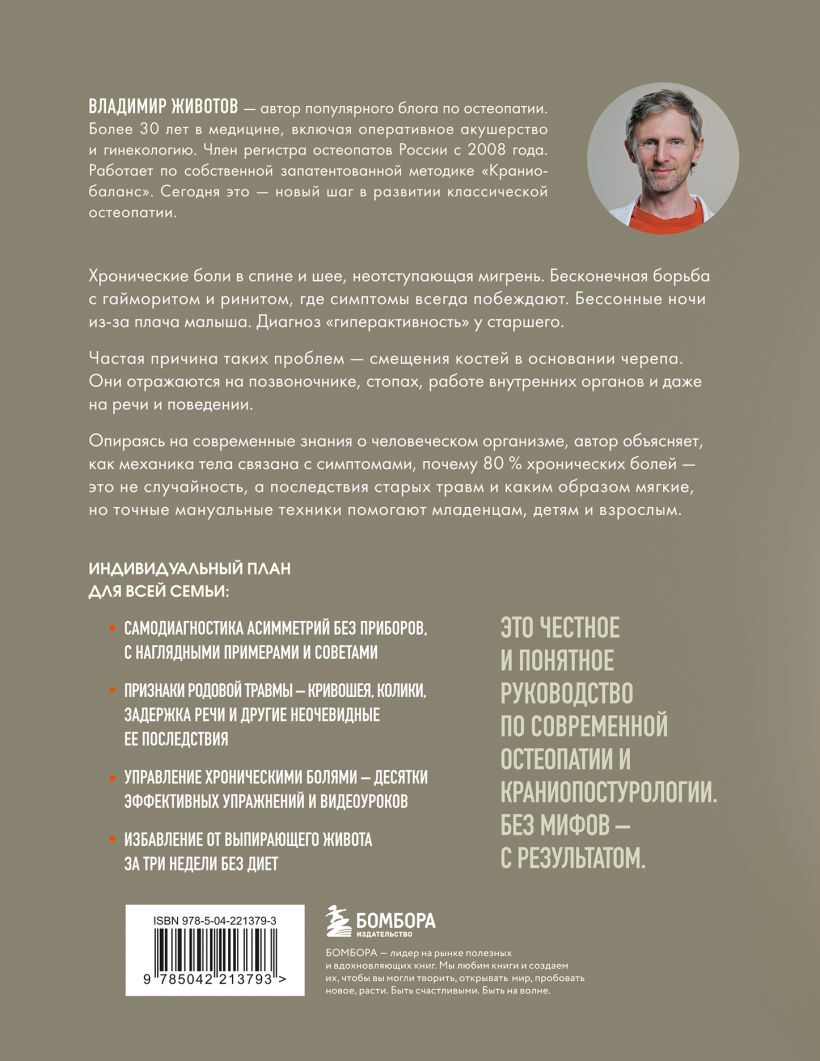 В книге собран уникальный опыт врача-остеопата с почти 20-летней практикой. Автор подробно рассказывает, почему 80 % хронических болей, будь то мигрень, гайморит, бессонница и множество других, – это не случайность, а последствия старых травм, с помощью пошаговой самодиагностики учит слушать сигналы своего тела. И главное, доступно объясняет и показывает в видеоуроках, как избавиться от недуга навсегда.