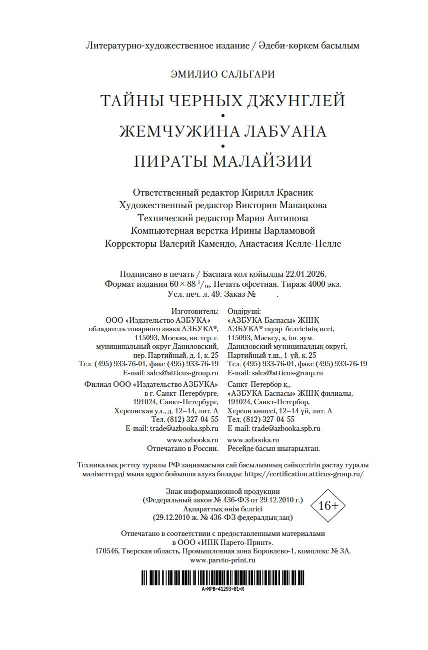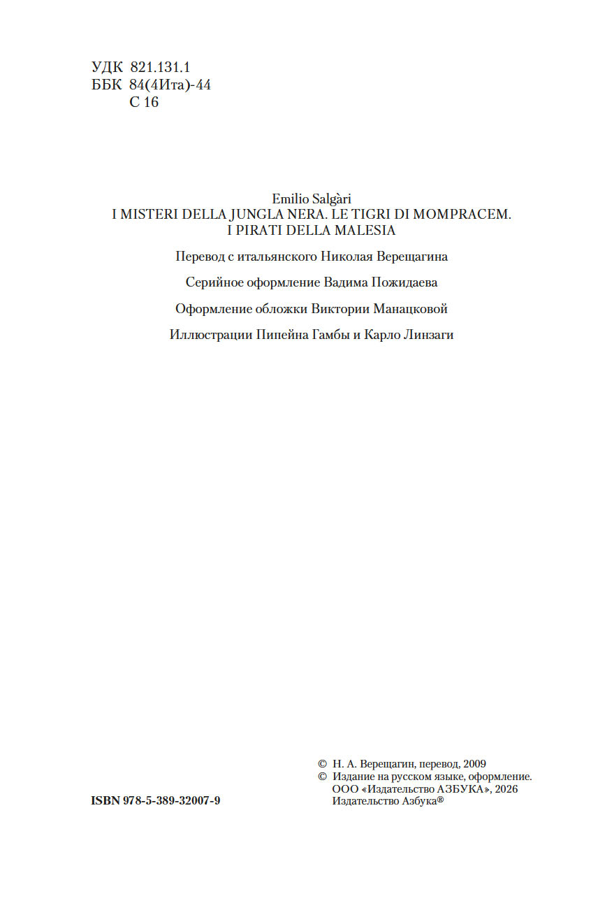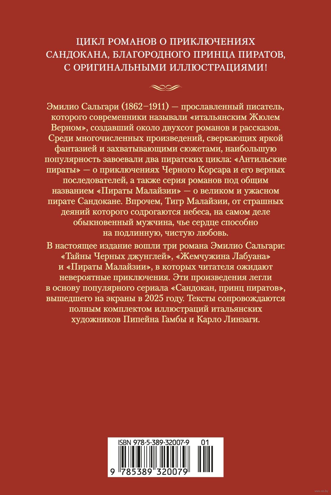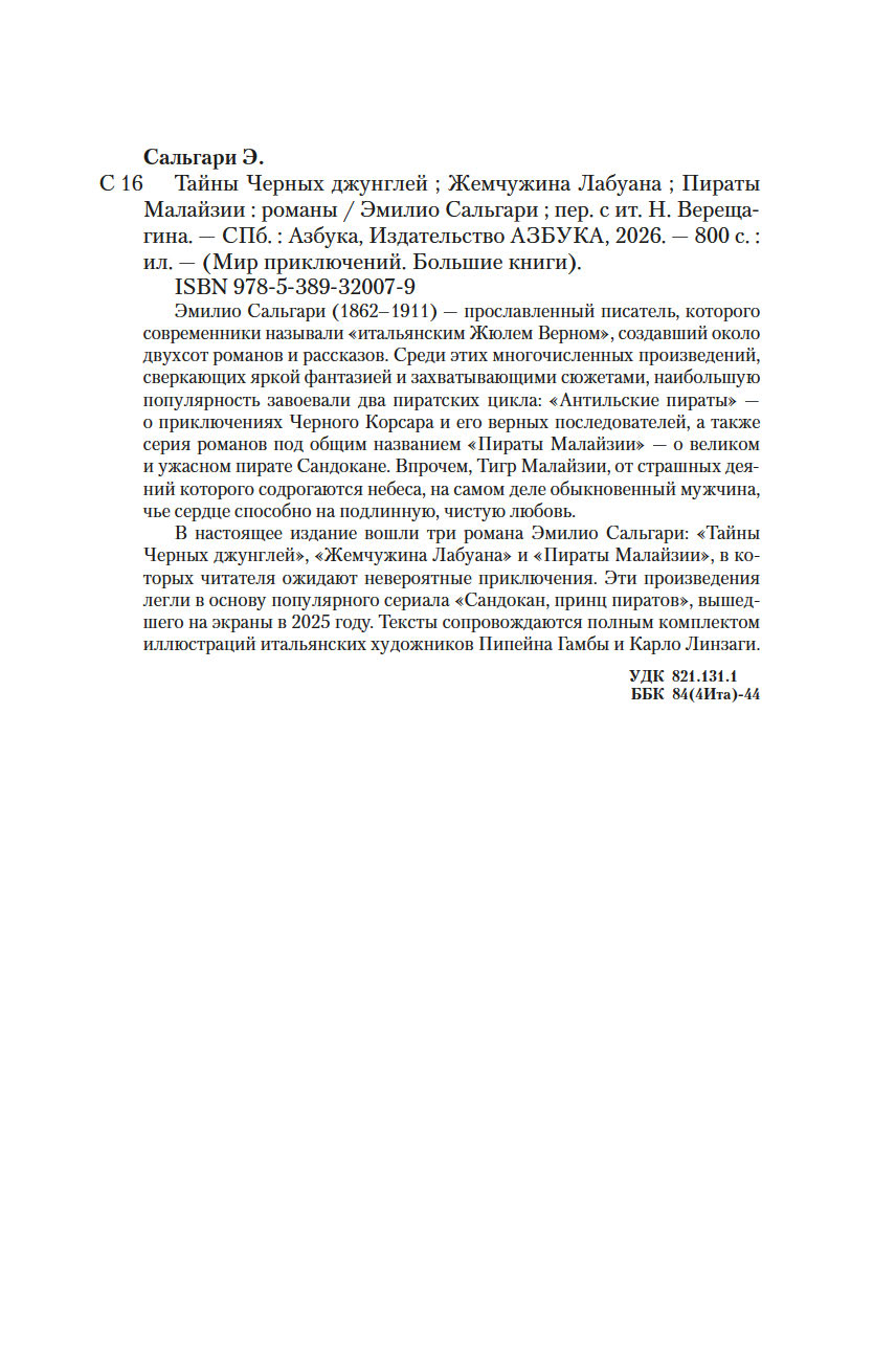 В настоящее издание вошли три романа Эмилио Сальгари: "Тайны Черных джунглей", "Жемчужина Лабуана" и "Пираты Малайзии", в которых читателя ожидают невероятные приключения. Эти произведения легли в основу популярного сериала "Сандокан, принц пиратов", вышедшего на экраны в 2025 году. Тексты сопровождаются полным комплектом иллюстраций итальянских художников Пипейна Гамбы и Карло Линзаги.
