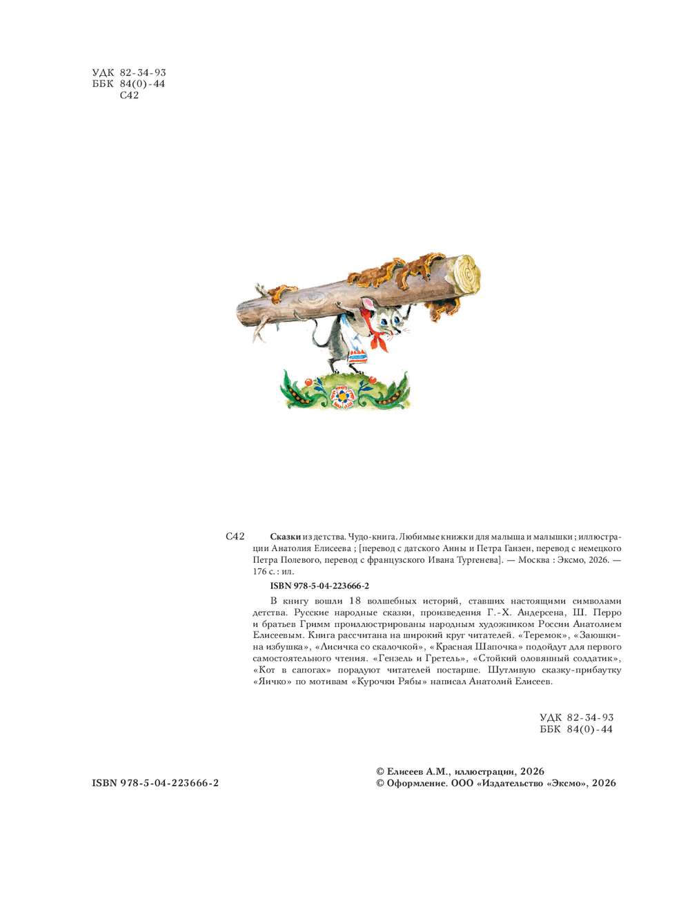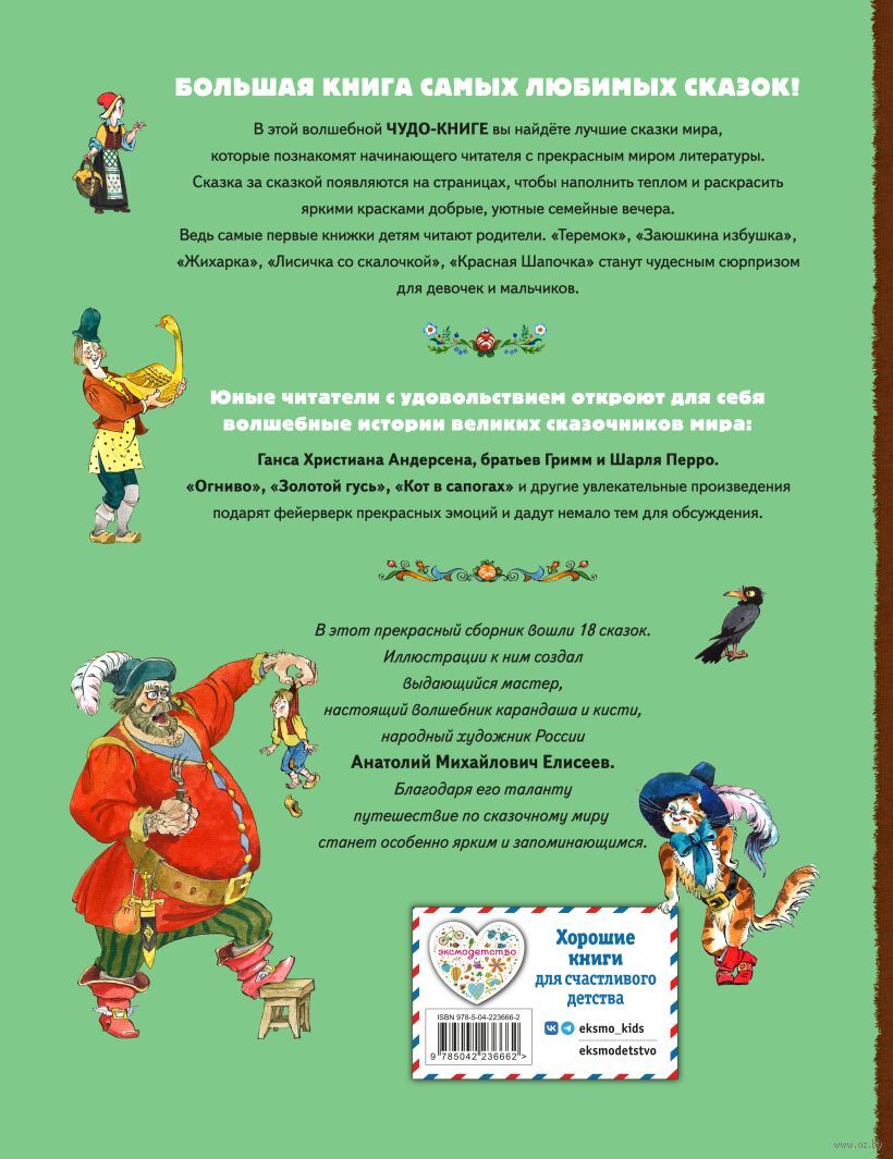 В книгу вошли 18 волшебных историй, ставших настоящими символами детства. Русские народные сказки, произведения Г.-Х. Андерсена, Ш. Перро и братьев Гримм проиллюстрированы народным художником России Анатолием Елисеевым. Книга рассчитана на широкий круг читателей. "Теремок", "Заюшкина избушка", "Лисичка со скалочкой", "Красная Шапочка" подойдут для первого самостоятельного чтения. "Гензель и Гретель", "Стойкий оловянный солдатик", "Кот в сапогах" порадуют читателей постарше. Шутливую сказку-прибаутку "Яичко" по мотивам "Курочки Рябы" написал Анатолий Елисеев.