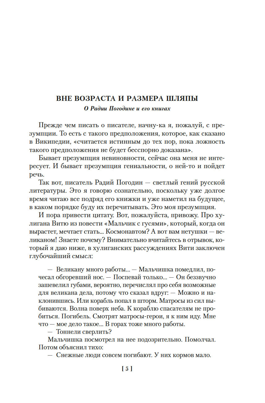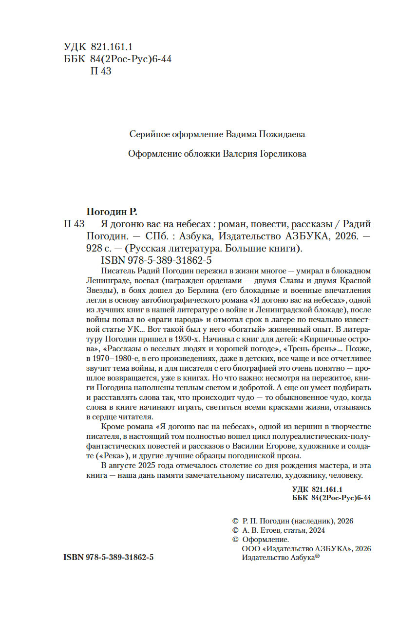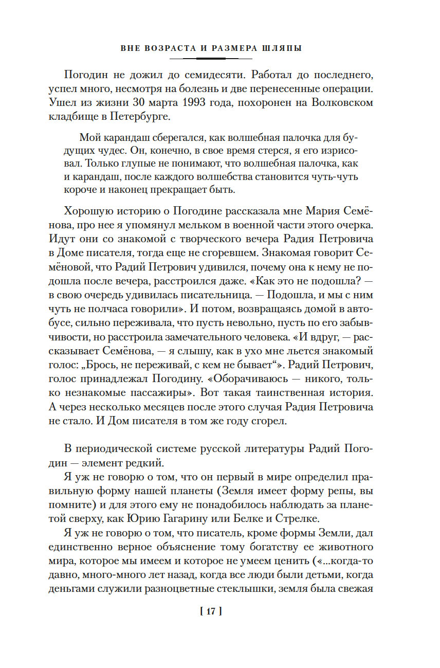 Писатель Радий Погодин пережил в жизни многое – умирал в блокадном Ленинграде, воевал (награжден орденами – двумя Славы и двумя Красной Звезды), в боях дошел до Берлина (его блокадные и военные впечатления легли в основу автобиографического романа "Я догоню вас на небесах", одной из лучших книг в нашей литературе о войне и Ленинградской блокаде), после войны попал во «враги народа» и отмотал срок в лагере по печально известной статье УК… Вот такой был у него "богатый" жизненный опыт. В литературу Погодин пришел в 1950-х. Начинал с книг для детей: "Кирпичные острова", "Рассказы о веселых людях и хорошей погоде", "Трень-брень"… Позже, в 1970–1980-е, в его произведениях, даже в детских, все чаще и все отчетливее звучит тема войны, и для писателя с его биографией это очень понятно – прошлое возвращается, уже в книгах. Но что важно: несмотря на пережитое, книги Погодина наполнены теплым светом и добротой. А еще он умеет подбирать и расставлять слова так, что происходит чудо – то обыкновенное чудо, когда слова в книге начинают играть, светиться всеми красками жизни, отзываясь в сердце читателя.
