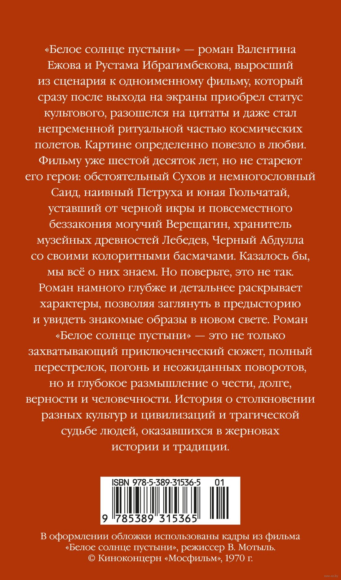 "Белое солнце пустыни" – роман Валентина Ежова и Рустама Ибрагимбекова, выросший из сценария к одноименному фильму, который сразу после выхода на экраны приобрел статус культового, разошелся на цитаты и даже стал непременной ритуальной частью космических полетов. Картине определенно повезло в любви. Фильму уже шестой десяток лет, но не стареют его герои: обстоятельный Сухов и немногословный Саид, наивный Петруха и юная Гюльчатай, уставший от черной икры и повсеместного беззакония могучий Верещагин, хранитель музейных древностей Лебедев, Черный Абдулла со своими колоритными басмачами. Казалось бы, мы всё о них знаем. Но поверьте – это не так. Роман намного глубже и детальнее раскрывает характеры, позволяя заглянуть в предысторию и увидеть знакомые образы в новом свете.
