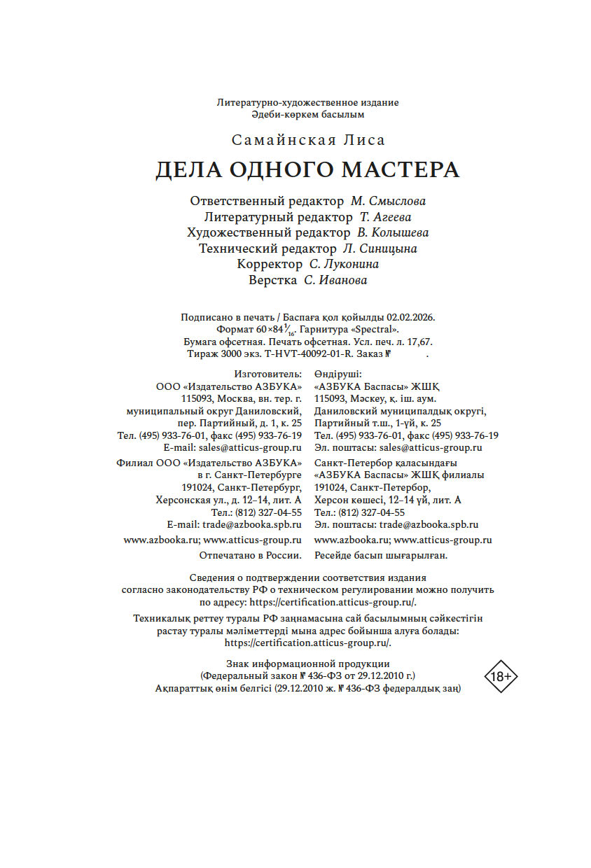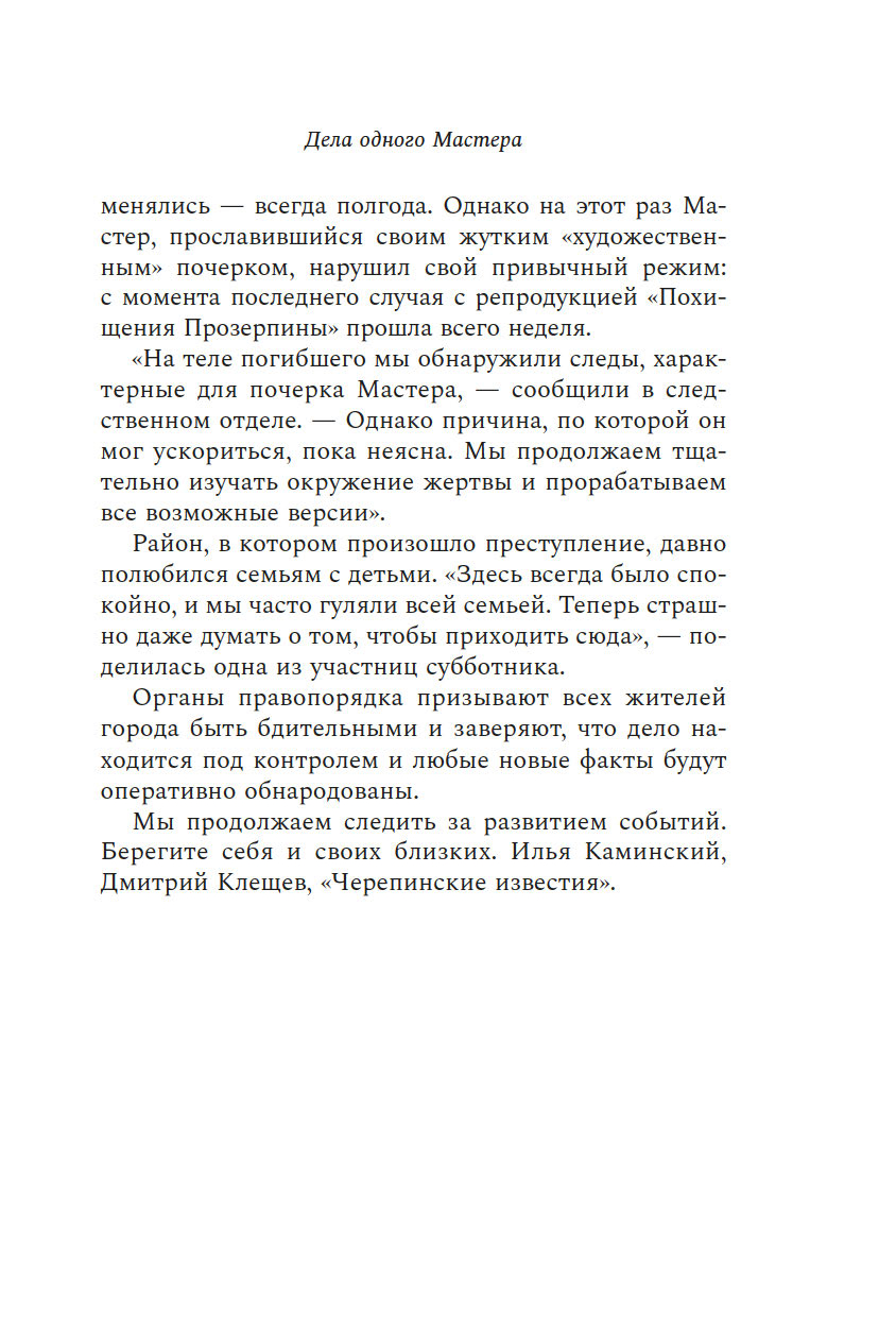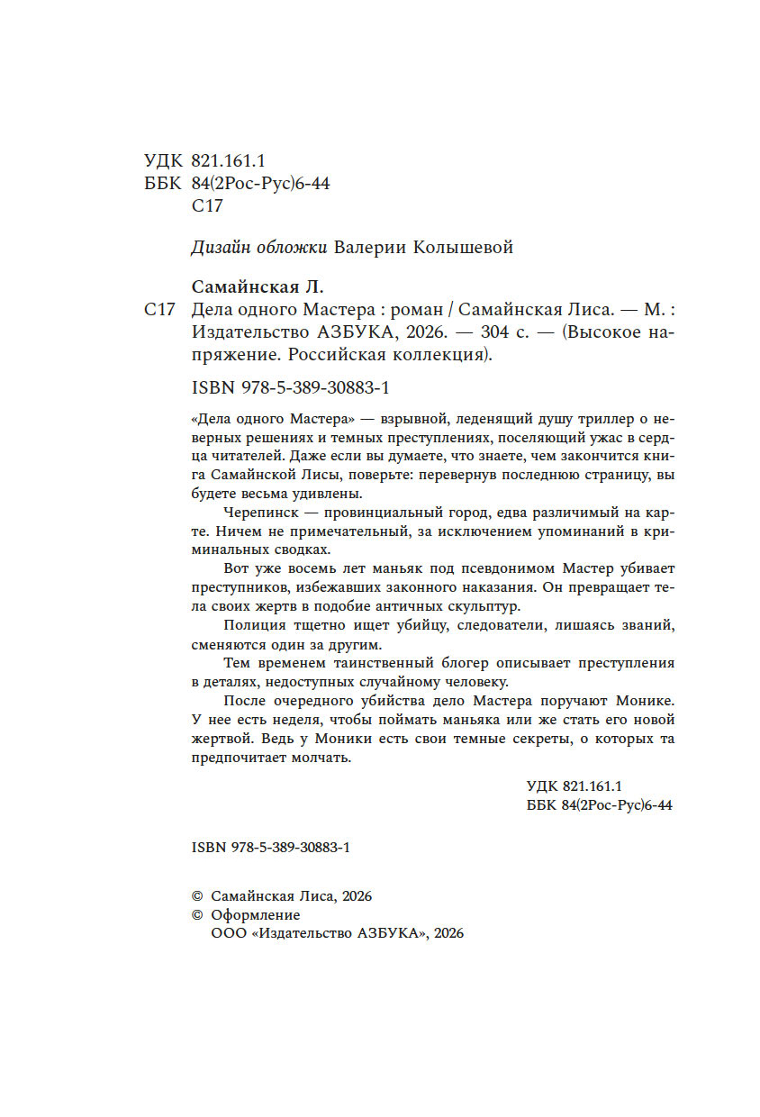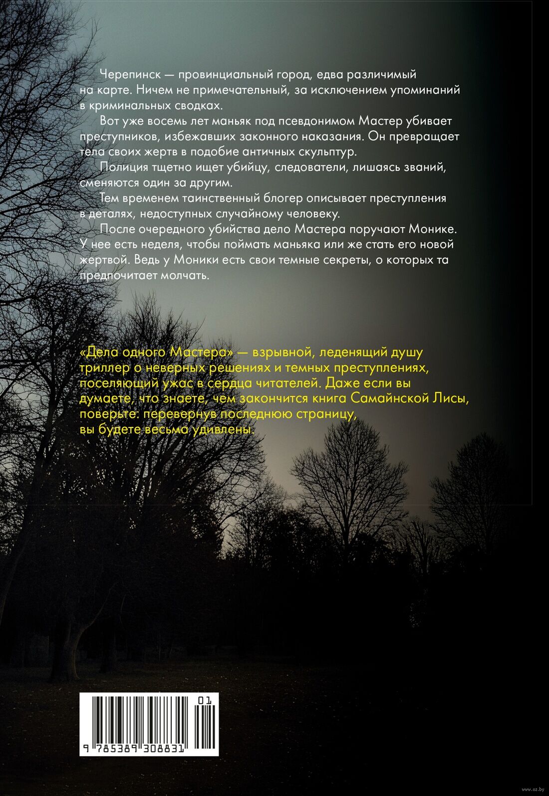 "Дела одного Мастера" – взрывной, леденящий душу триллер о неверных решениях и темных преступлениях, поселяющий ужас в сердца читателей. Даже если вы думаете, что знаете, чем закончится книга Самайнской Лисы, поверьте: перевернув последнюю страницу, вы будете весьма удивлены.