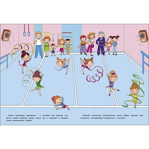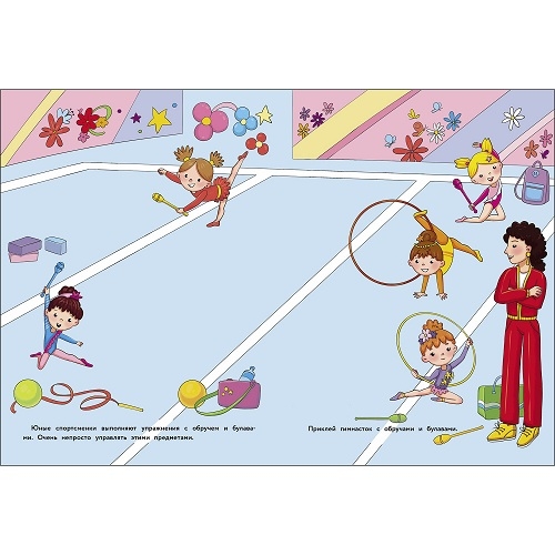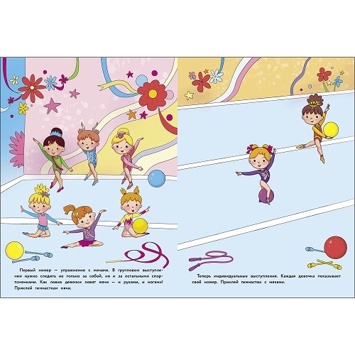 Давай вместе посмотрим их выступления. А с многоразовыми наклейками будет вдвойне интересно! Приклеивай гимнасток, мячи и ленты. Придумай девочкам имена и выбери победителя!