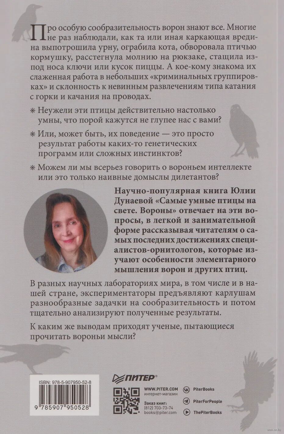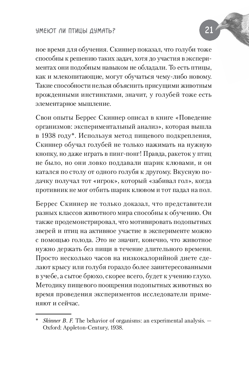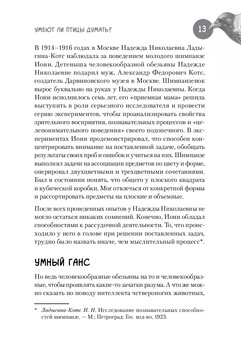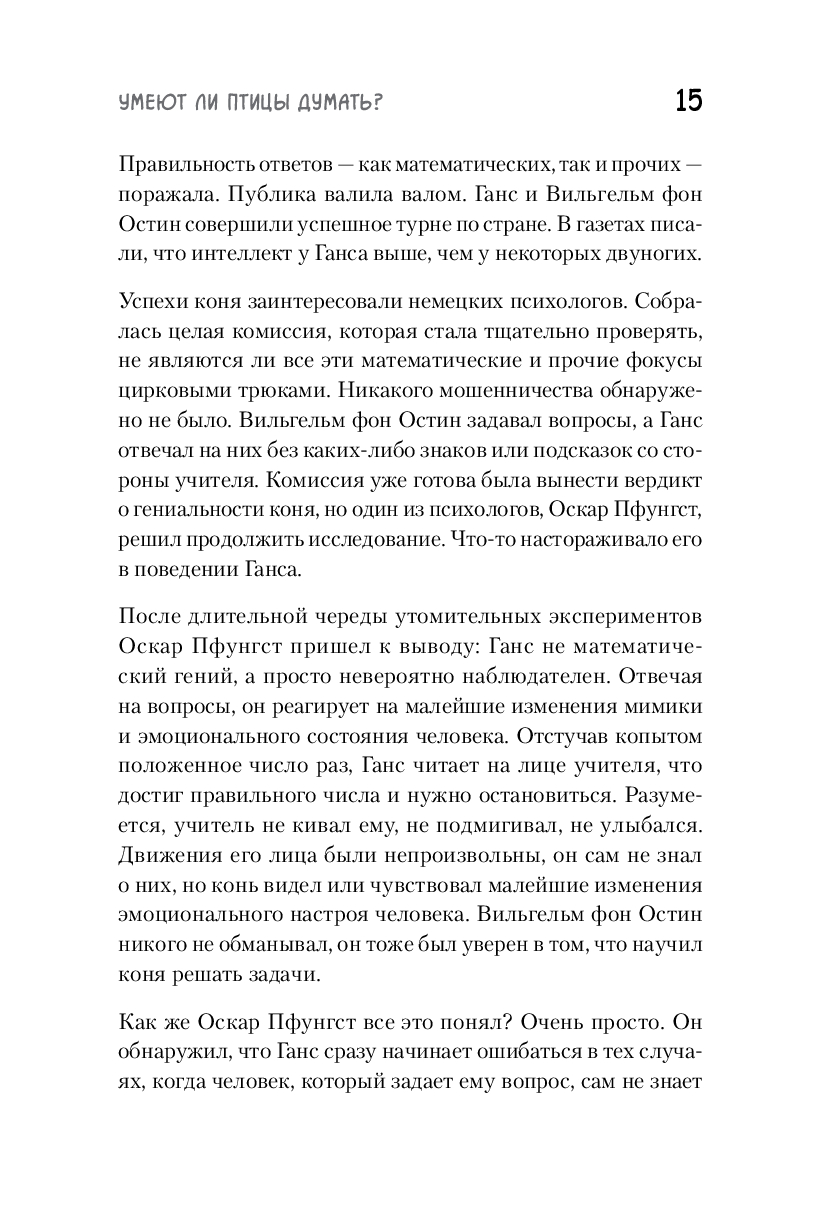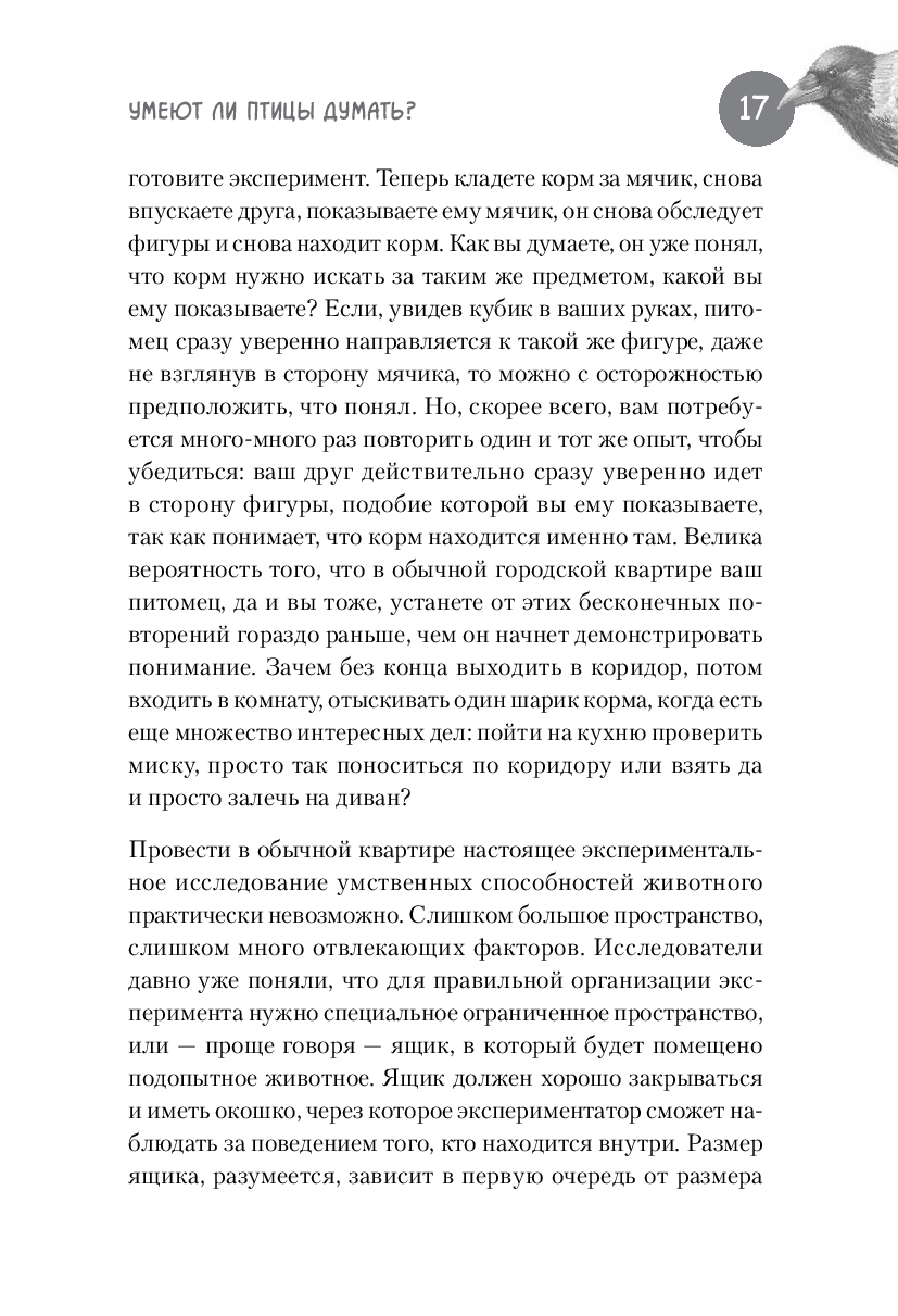 Научно-популярная книга Юлии Дунаевой отвечает на эти вопросы, в легкой и занимательной форме рассказывая читателям о результатах научных исследований специалистов, которые изучают особенности элементарного мышления ворон и других птиц. В разных научных лабораториях мира, в том числе и в нашей стране, экспериментаторы предъявляют карлушам разнообразные задачки на сообразительность и потом тщательно анализируют полученные результаты. К каким же выводам приходят ученые, пытающиеся прочитать вороньи мысли?