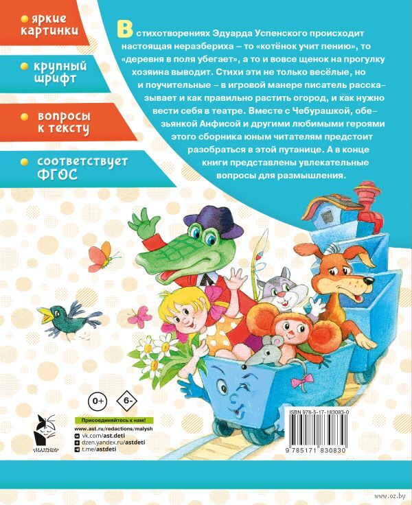 В этой книге собраны самые лучшие и известные стихотворения Эдуарда Успенского, многие из которых знакомы читателям в виде песен из любимых мультфильмов. Весёлые, остроумные и поучительные, эти тексты дают возможность детям в игровой форме научиться чему-то новому вместе с Чебурашкой, Крокодилом Геной и другими любимыми героями. В конце сборника приведены вопросы, которые помогут юным читателям лучше понять удивительный мир произведений Эдуарда Успенского и расширить свой кругозор.