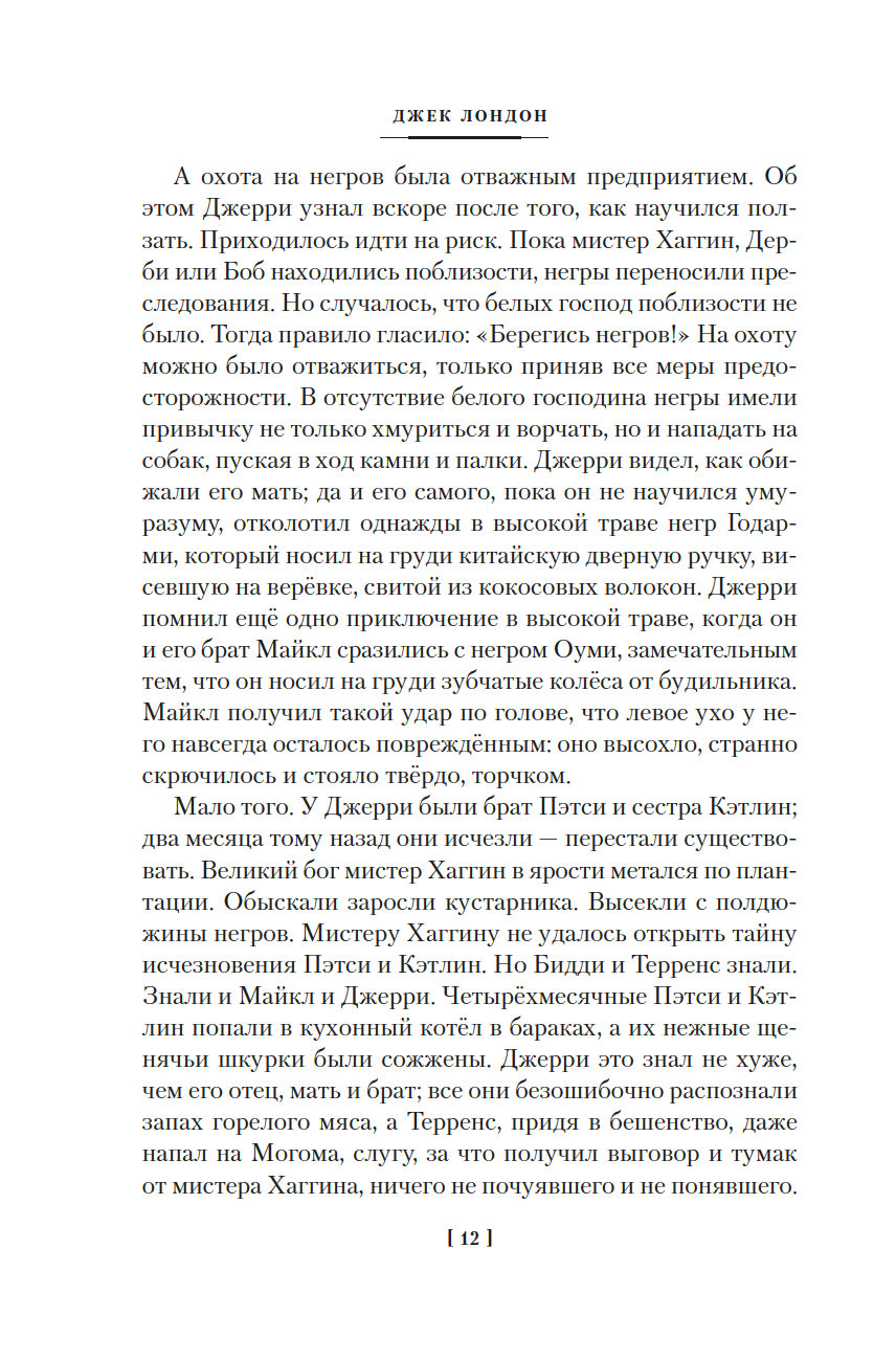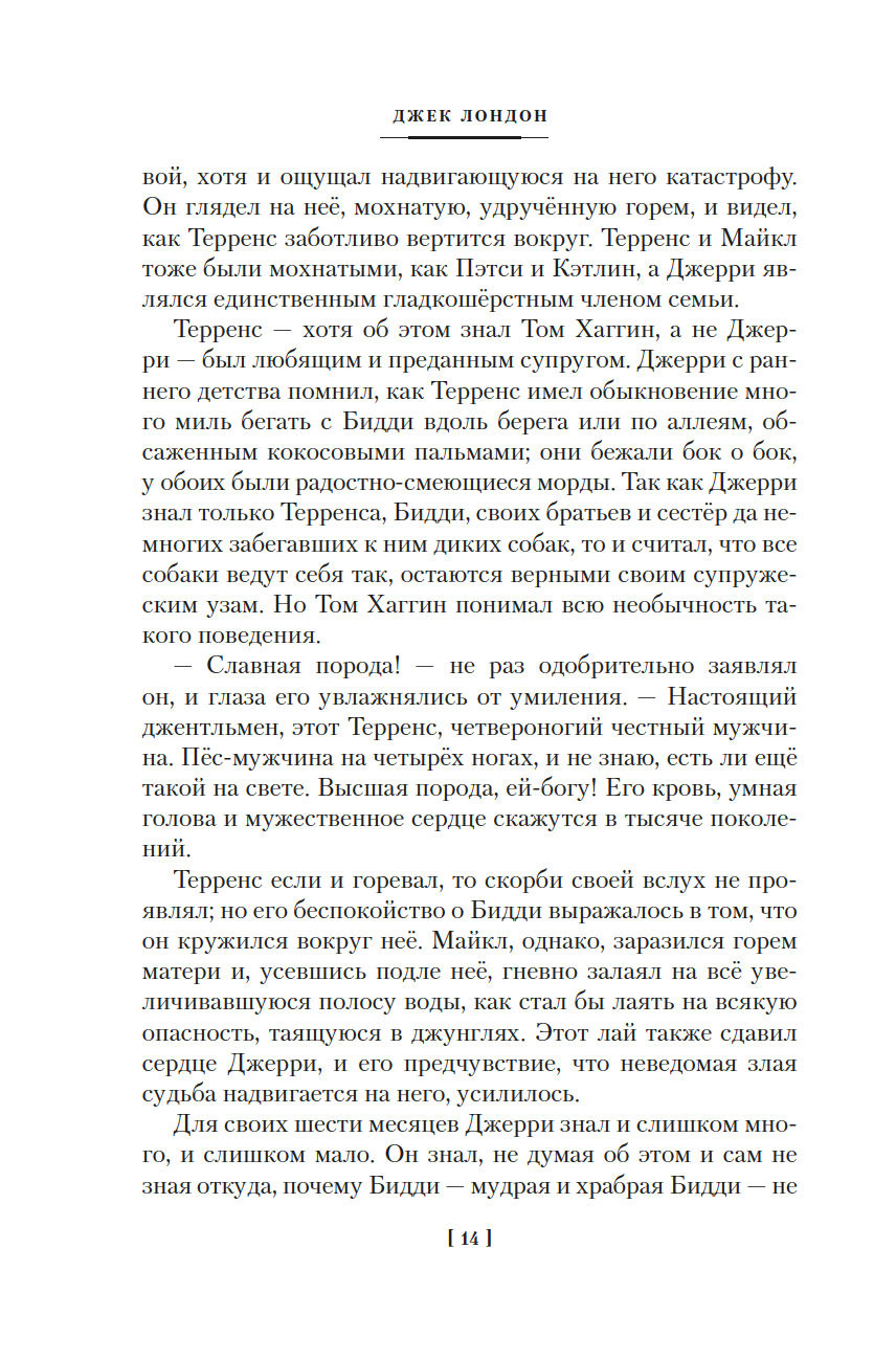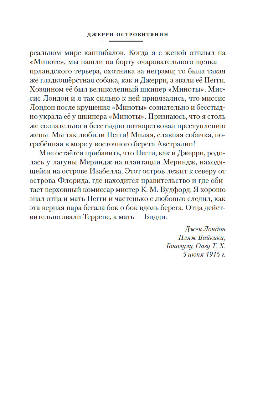 Джек Лондон, выдающийся классик американской литературы рубежа XIX-XX веков, создал множество романов, рассказов и повестей о животных, однако вошедшие в этот сборник истории "Джерри-островитянин" и "Майкл, брат Джерри" занимают в творчестве автора особое место. В них Лондон обнажает своё резко негативное отношение к жестокому обращению с братьями нашими меньшими.