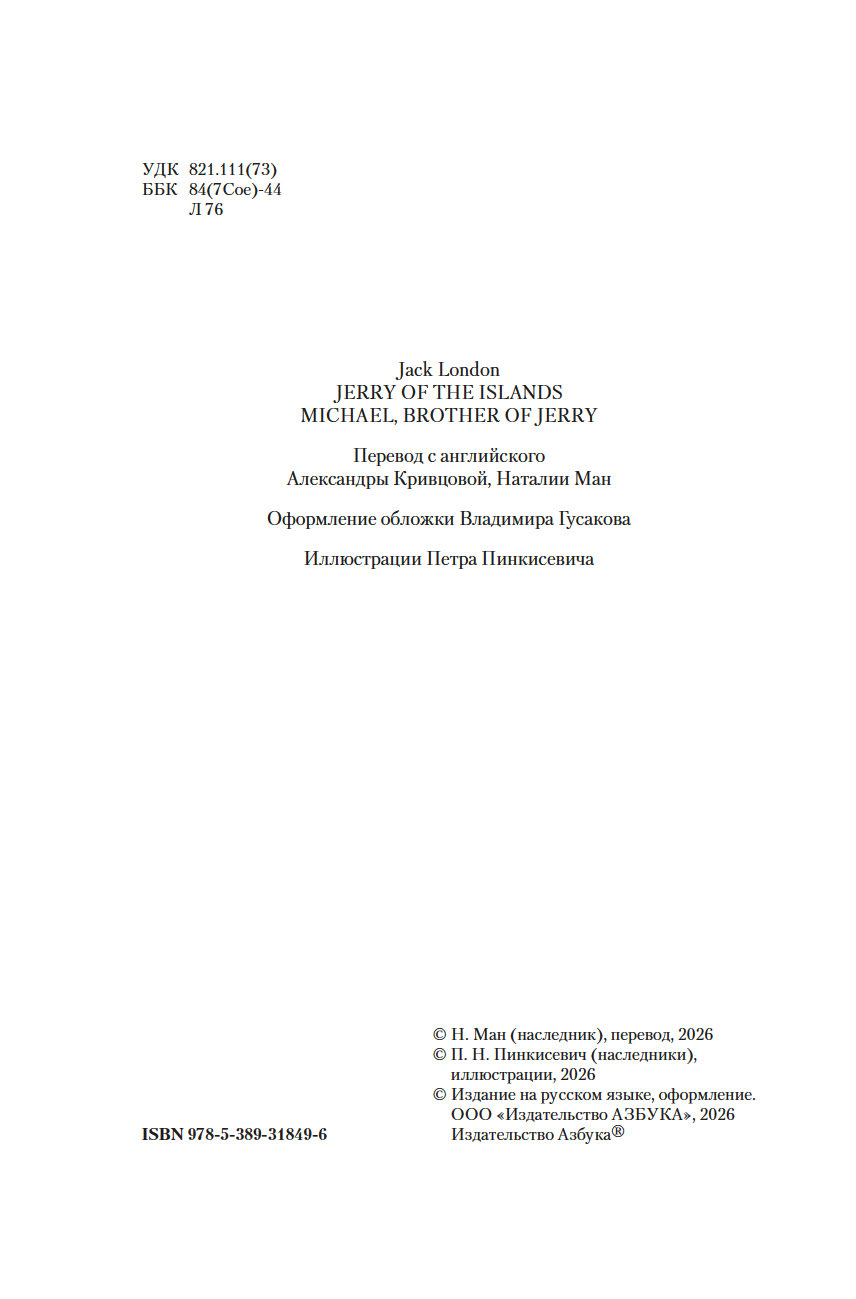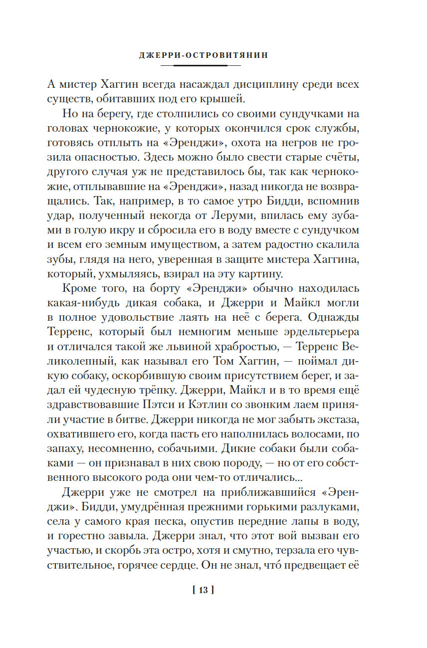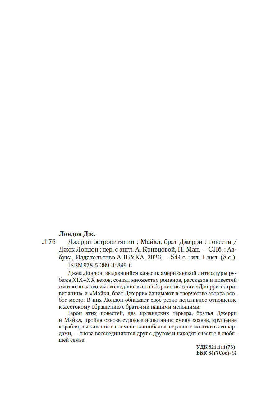 Джек Лондон, выдающийся классик американской литературы рубежа XIX-XX веков, создал множество романов, рассказов и повестей о животных, однако вошедшие в этот сборник истории "Джерри-островитянин" и "Майкл, брат Джерри" занимают в творчестве автора особое место. В них Лондон обнажает своё резко негативное отношение к жестокому обращению с братьями нашими меньшими.