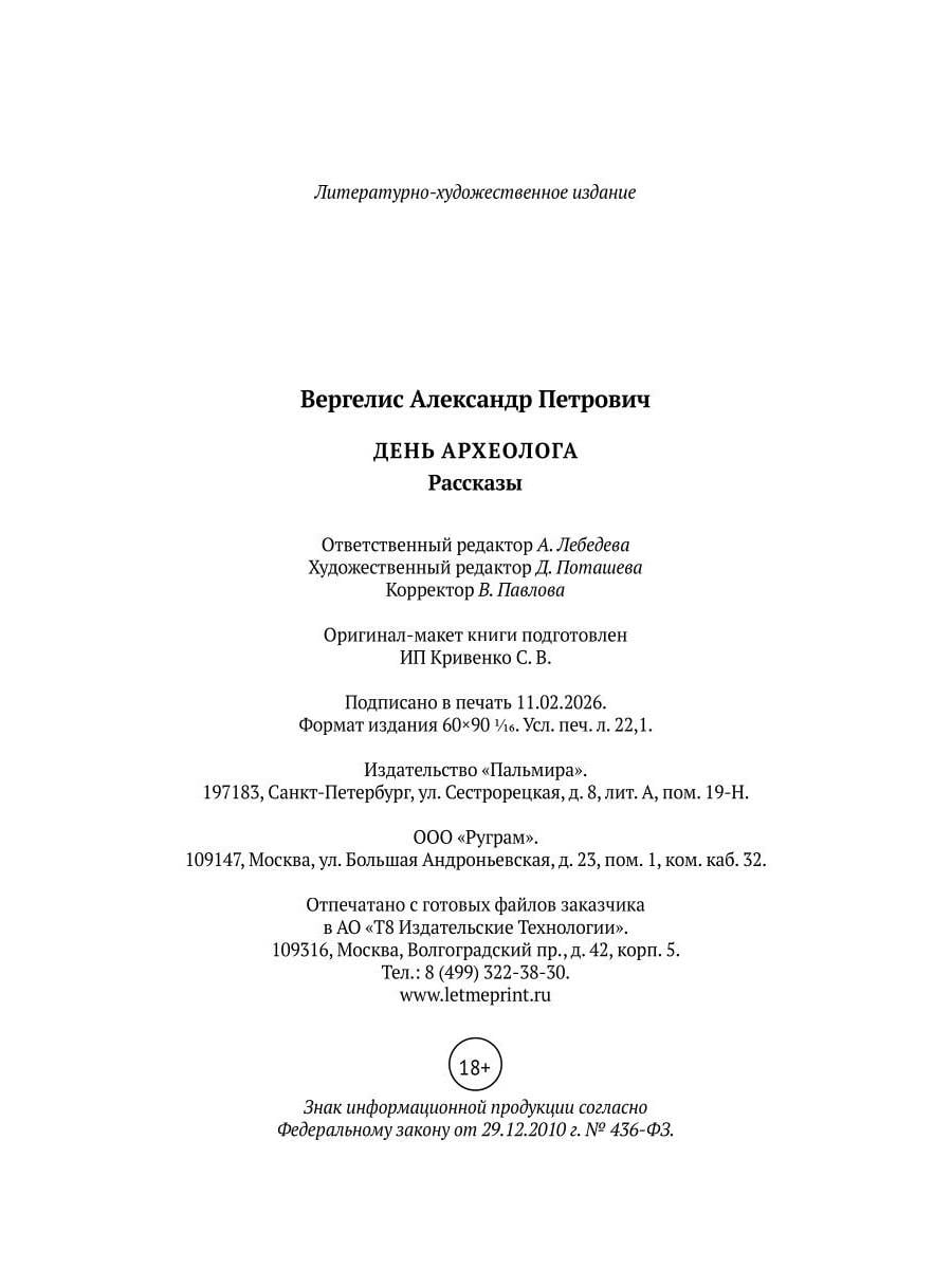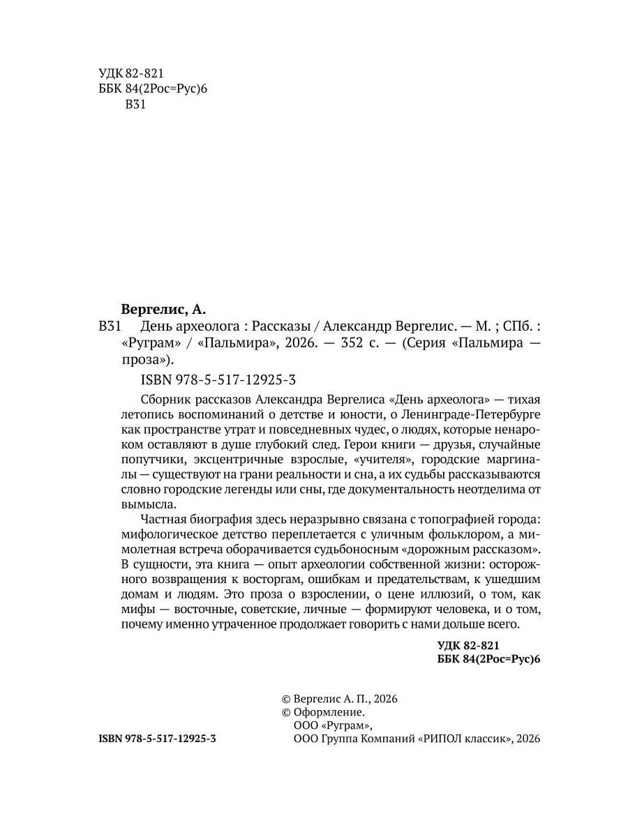 Сборник рассказов Александра Вергелиса "День археолога" – тихая летопись воспоминаний о детстве и юности, о Ленинграде-Петербурге как пространстве утрат и повседневных чудес, о людях, которые ненароком оставляют в душе глубокий след. Герои книги – друзья, случайные попутчики, эксцентричные взрослые, "учителя", городские маргиналы – существуют на грани реальности и сна, а их судьбы рассказываются словно городские легенды или сны, где документальность неотделима от вымысла.