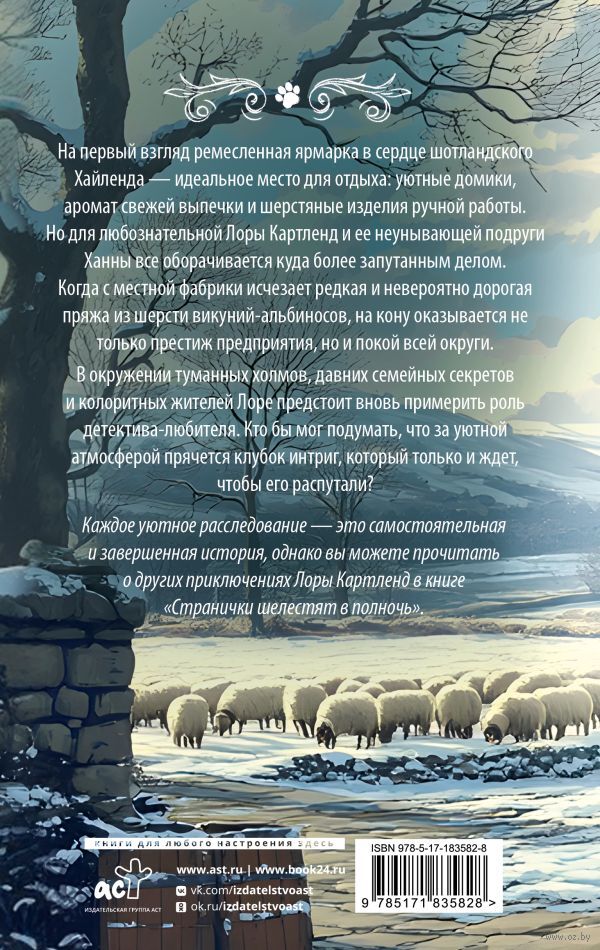 На первый взгляд ремесленная ярмарка в сердце шотландского Хайленда – идеальное место для отдыха: уютные домики, мирно пасущиеся стада овец, аромат свежей выпечки и шерстяные изделия ручной работы. Но для любознательной Лоры Картленд и ее неунывающей подруги Ханны все оборачивается куда более запутанным делом. Когда с местной фабрики исчезает редкая и невероятно дорогая пряжа из шерсти викуний-альбиносов, на кону оказывается не только престиж предприятия, но и покой всей округи.