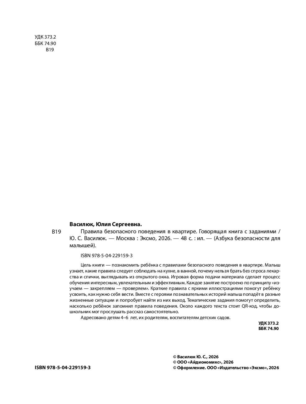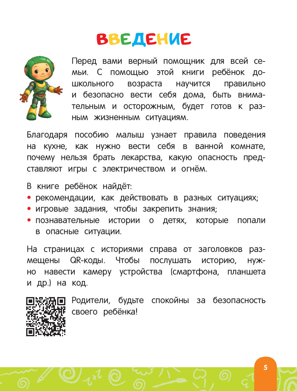 Цель книги – познакомить ребёнка с правилами безопасного поведения в квартире. Малыш узнает, какие правила следует соблюдать на кухне, в ванной, почему нельзя брать без спроса лекарства и спички, выглядывать из открытого окна. Игровая форма подачи материала сделает процесс обучения интересным, увлекательным и эффективным. Каждое занятие построено по принципу "изучаем – закрепляем – проверяем". Краткие правила с яркими иллюстрациями помогут ребёнку усвоить, как нужно себя вести. Вместе с героями познавательных историй малыш попадёт в разные жизненные ситуации и попробует найти из них выход. Тематические задания помогут определить, насколько ребёнок запомнил правила поведения. Около каждого текста стоит QR код, чтобы дошкольник мог прослушать рассказ самостоятельно.