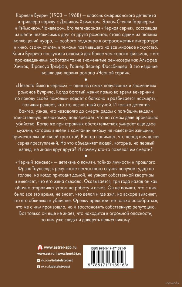 "Невеста была в черном" – один из самых популярных и знаменитых романов Вулрича. Когда богатый жених прямо во время вечеринки по поводу своей помолвки падает с балкона и разбивается насмерть, полиция решает, что это несчастный случай. И только детектив Вангер, узнав, что незадолго до смерти рядом с погибшим видели таинственную незнакомку, подозревает, что на самом деле произошло убийство. Когда же при странных обстоятельствах умирает еще двое мужчин, которых видели в компании никому не известной женщины, примечательной своей красотой, Вангер понимает, что перед ним целая серия преступлений. Но что объединяет людей, которые на первый взгляд не знали друг друга? И почему кто-то пожелал им смерти?