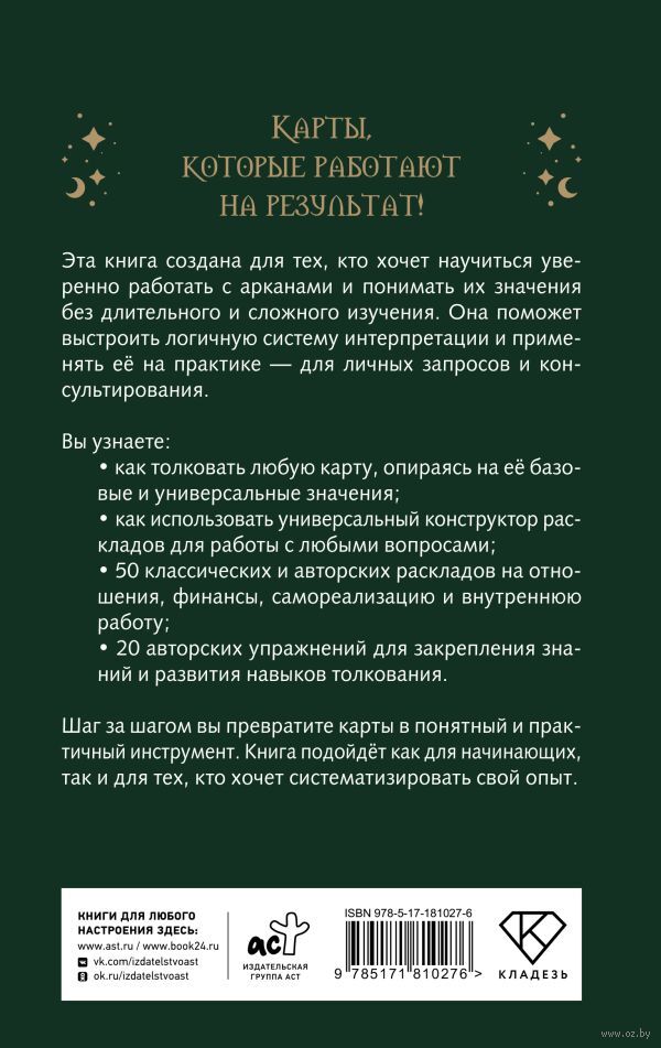 Эта книга создана для тех, кто хочет научиться уверенно работать с арканами и понимать их значения без длительного и сложного изучения. Она поможет выстроить логичную систему интерпретации и применять её на практике – для личных запросов и консультирования.