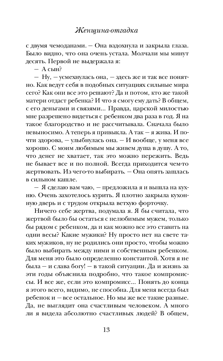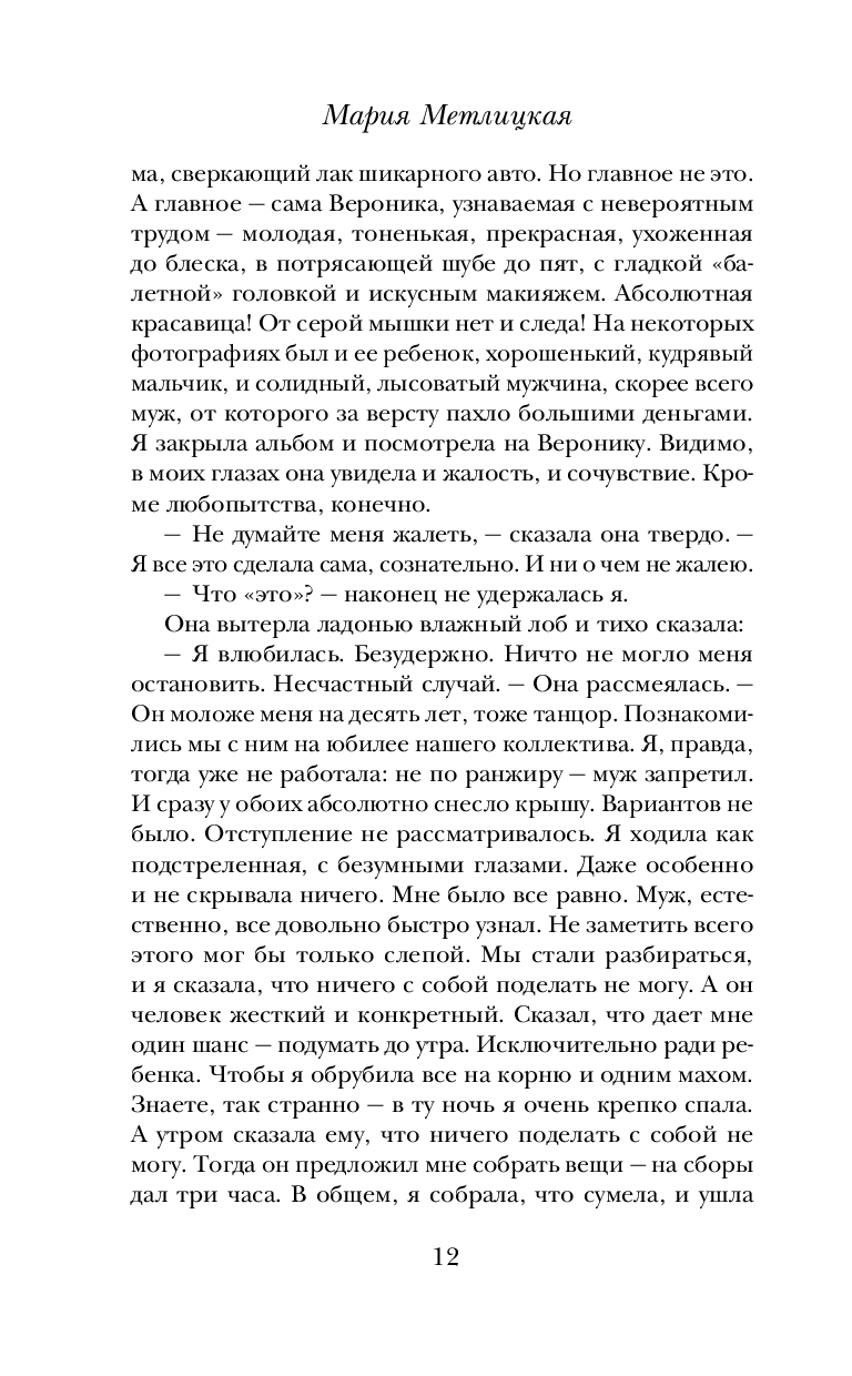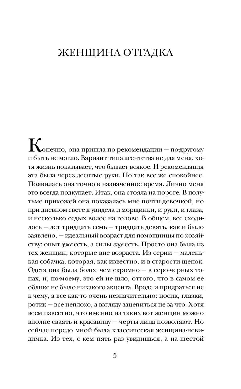 Для Марии Метлицкой нет неинтересных судеб. Она уверена: каждая женщина, даже на первый взгляд ничем не примечательная, – загадка. Почему ее героиня поступила так или иначе? Почему пожертвовала своим покоем, комфортом ради близкого, а иногда и не очень близкого человека? Почему полюбила того, кто никогда не сможет сделать ее счастливой? Неужели дело в пресловутой женской логике, точнее в отсутствии логического мышления, в чем так часто упрекают женщин?