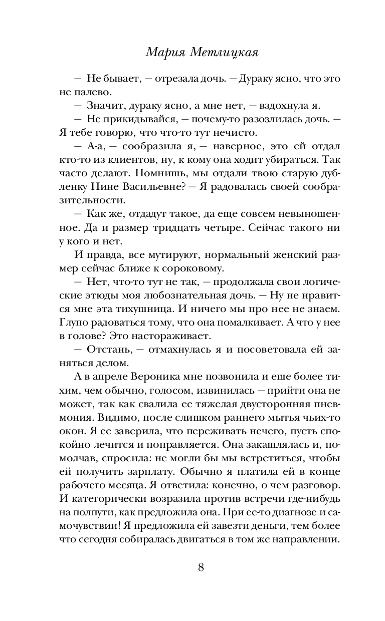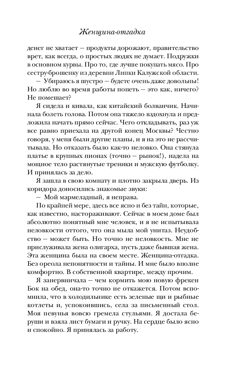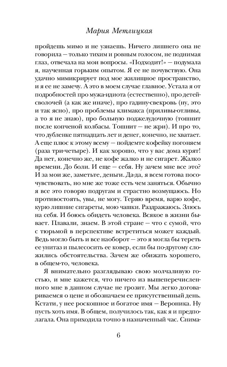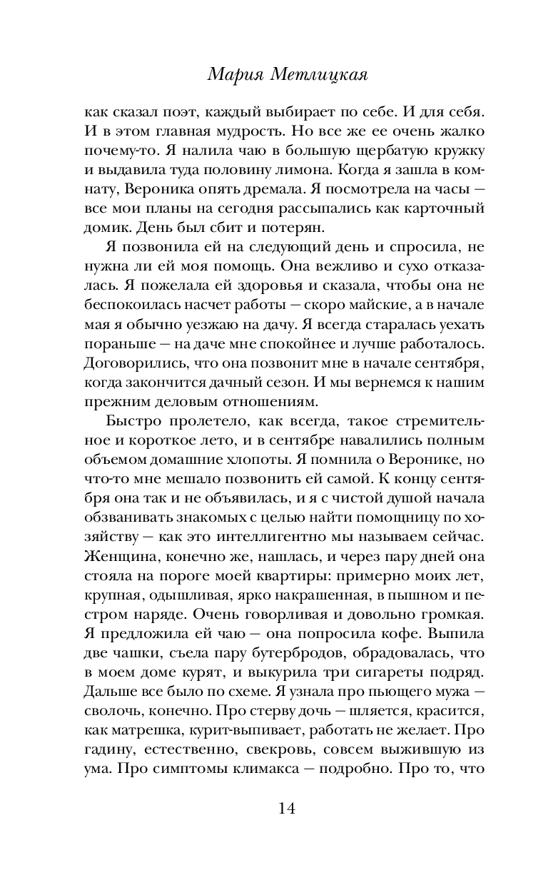 Для Марии Метлицкой нет неинтересных судеб. Она уверена: каждая женщина, даже на первый взгляд ничем не примечательная, – загадка. Почему ее героиня поступила так или иначе? Почему пожертвовала своим покоем, комфортом ради близкого, а иногда и не очень близкого человека? Почему полюбила того, кто никогда не сможет сделать ее счастливой? Неужели дело в пресловутой женской логике, точнее в отсутствии логического мышления, в чем так часто упрекают женщин?