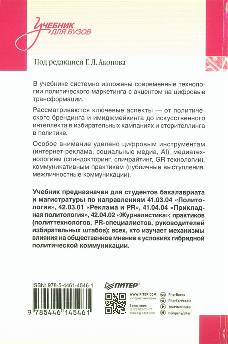 В учебнике системно изложены современные технологии политического маркетинга с акцентом на цифровые трансформации. Рассматриваются ключевые аспекты: от политического брендинга и имиджмейкинга до искусственного интеллекта в избирательных кампаниях и сторителлинга в политике. Особое внимание уделено: цифровым инструментам (интернет-реклама, социальные медиа, AI), медиатехнологиям (спиндокторинг, спичрайтинг, GR-технологии), коммуникативным практикам (публичные выступления, межличностные коммуникации).