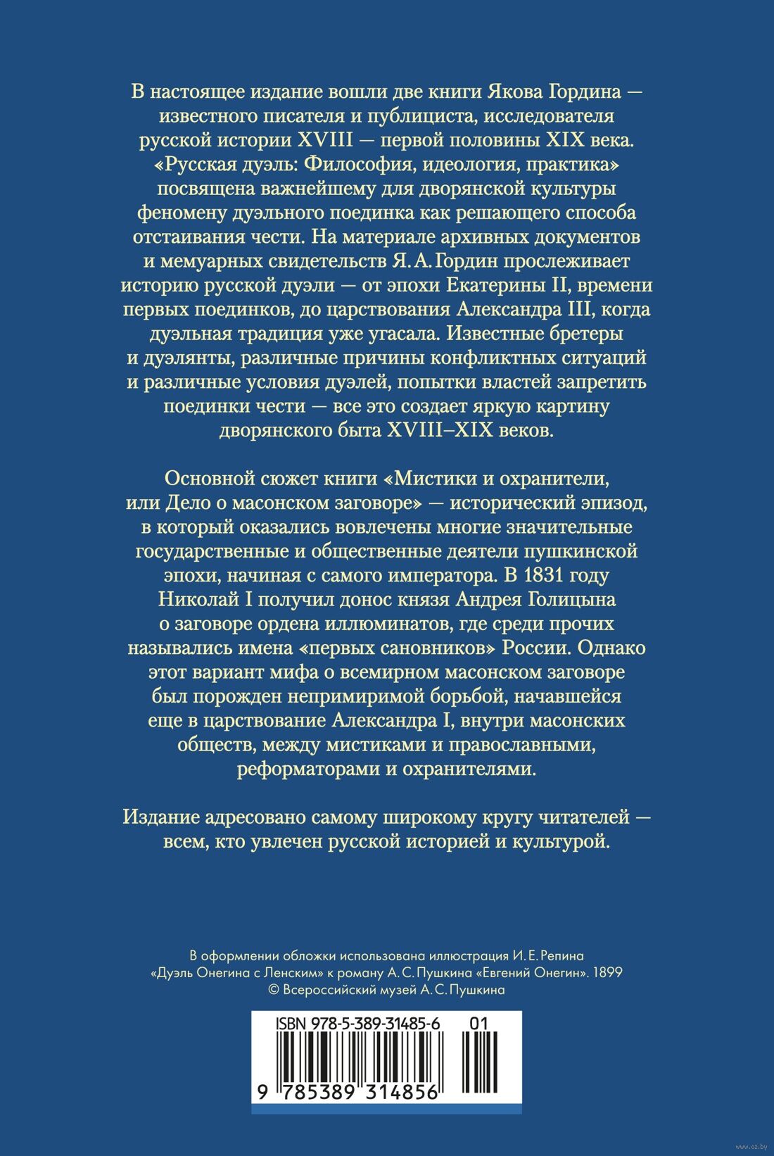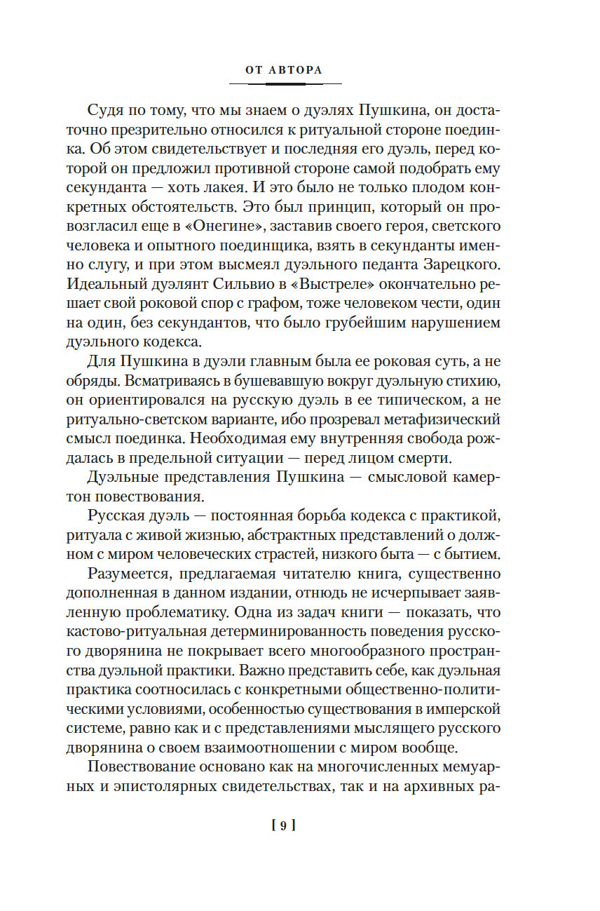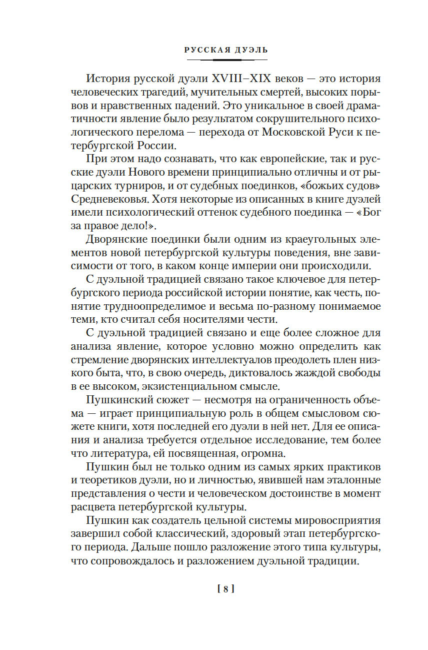 "Русская дуэль: Философия, идеология, практика" посвящена важнейшему для дворянской культуры феномену дуэльного поединка как решающего способа отстаивания чести. На материале архивных документов и мемуарных свидетельств Я. А. Гордин прослеживает историю русской дуэли – от эпохи Екатерины II, времени первых поединков, до царствования Александра III, когда дуэльная традиция уже угасала. Известные бретеры и дуэлянты, различные причины конфликтных ситуаций и различные условия дуэлей, попытки властей запретить поединки чести – все это создает яркую картину дворянского быта ХVIII-ХIХ веков.