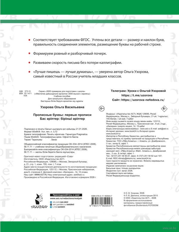 "Прописные буквы: первые прописи" – это новейшие прописи, разработанные по авторской методике самого известного в России учителя младших классов Ольги Узоровой. Основная цель пособия – довести до автоматизма написание всех букв. Отработка элементов в правильном порядке позволяет избежать многих ошибок и сразу сформировать красивый почерк. Устойчивый положительный результат всего за 10-15 минут ежедневных занятий – это реально.