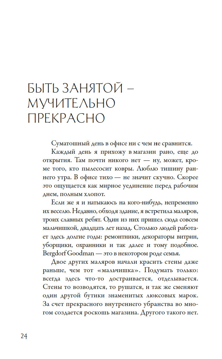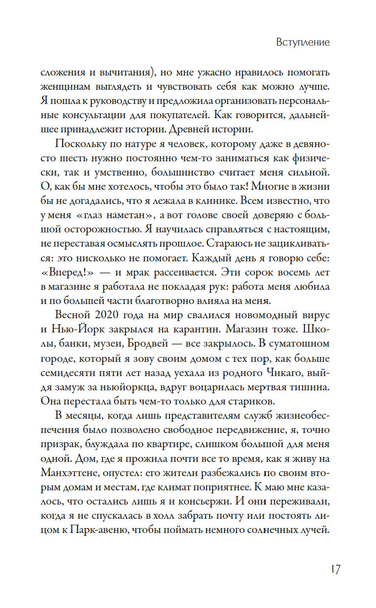 Представьте себе, мудрую, остроумную и бесконечно честную женщину,которая прошла через все: брак, развод, нервный срыв, блистательную карьеру в роскошном универмаге Bergdorf Goodman и одиночество. И прошла с гордо поднятой головой, улыбкой и ясным взглядом.