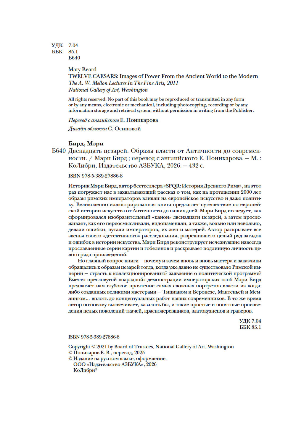 Историк Мэри Бирд, автор бестселлера "SPQR: История Древнего Рима", на этот раз погружает нас в захватывающий рассказ о том, как на протяжении 2000 лет образы римских императоров влияли на европейское искусство и даже политику. Великолепно иллюстрированная книга предлагает путешествие по европейской истории искусства от Античности до наших дней. Мэри Бирд исследует, как сформировался изобразительный "канон" двенадцати цезарей, а затем прослеживает, как его переосмысливали, видоизменяли, а также, вольно или невольно, делали ошибки, путали императоров, их жен и матерей. Автор раскрывает все звенья своего "детективного" расследования, разрешившего целый ряд загадок и ошибок в истории искусства. Мэри Бирд реконструирует исчезнувшие навсегда прославленные серии картин и гобеленов и раскрывает подлинную личность целого ряда произведений.