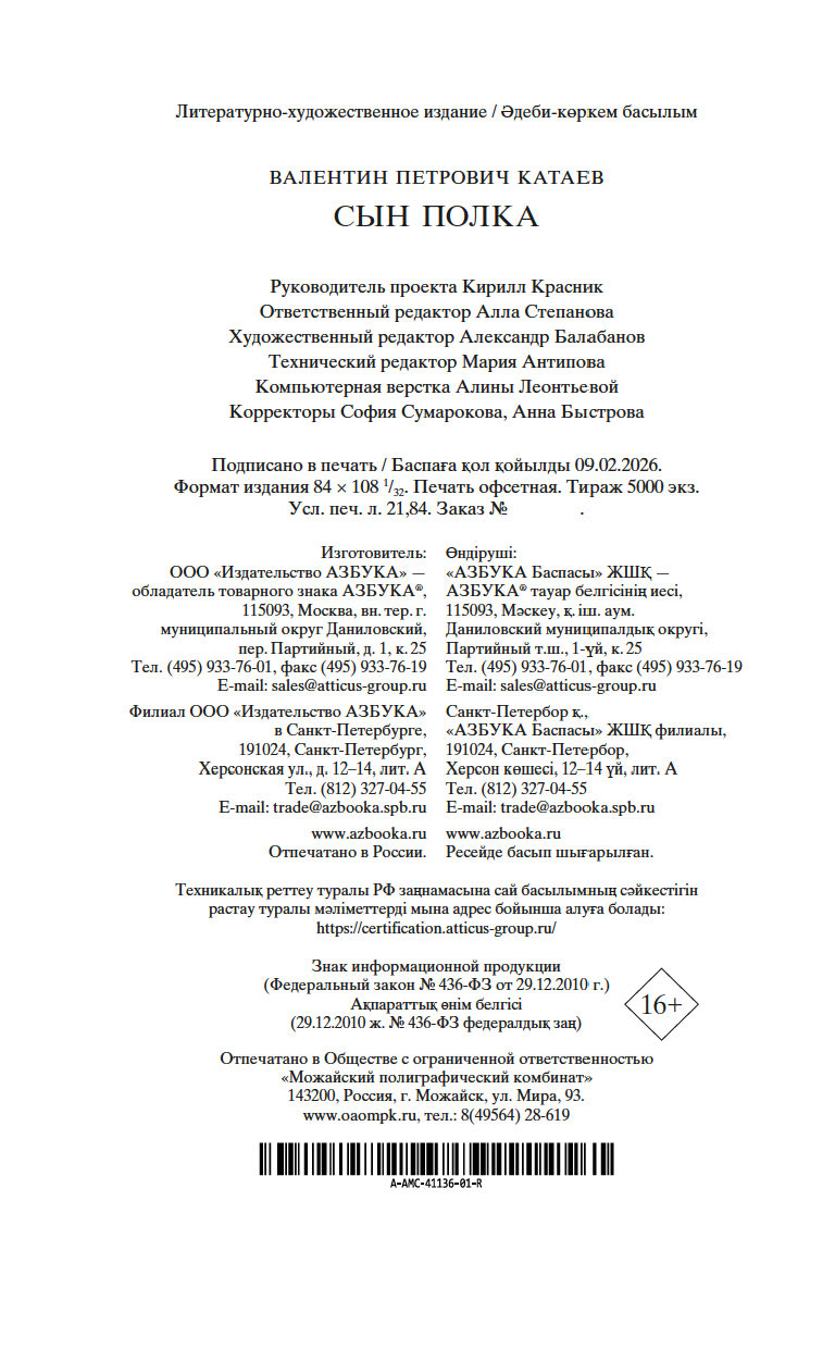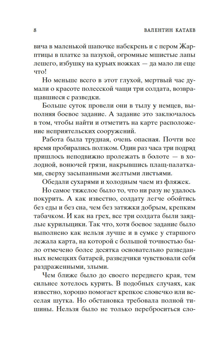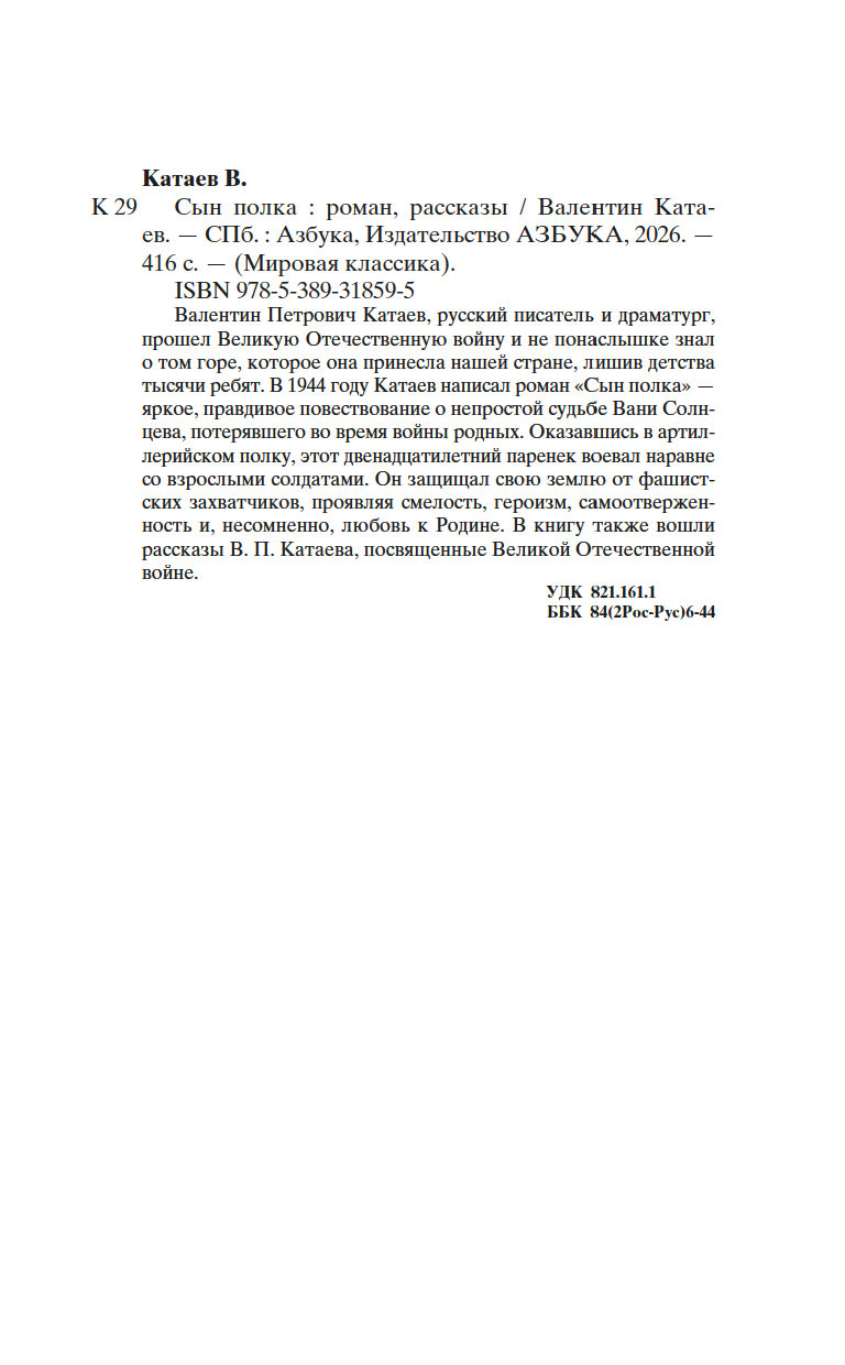 Валентин Петрович Катаев, русский писатель и драматург, прошел Великую Отечественную войну и не понаслышке знал о том горе, которое она принесла нашей стране, лишив детства тысячи ребят. В 1944 году Катаев написал роман "Сын полка" – яркое, правдивое повествование о непростой судьбе Вани Солнцева, потерявшего во время войны родных. Оказавшись в артиллерийском полку, этот двенадцатилетний паренек воевал наравне со взрослыми солдатами. Он защищал свою землю от фашистских захватчиков, проявляя смелость, героизм, самоотверженность и, несомненно, любовь к Родине. В книгу также вошли рассказы В. П. Катаева, посвященные Великой Отечественной войне.