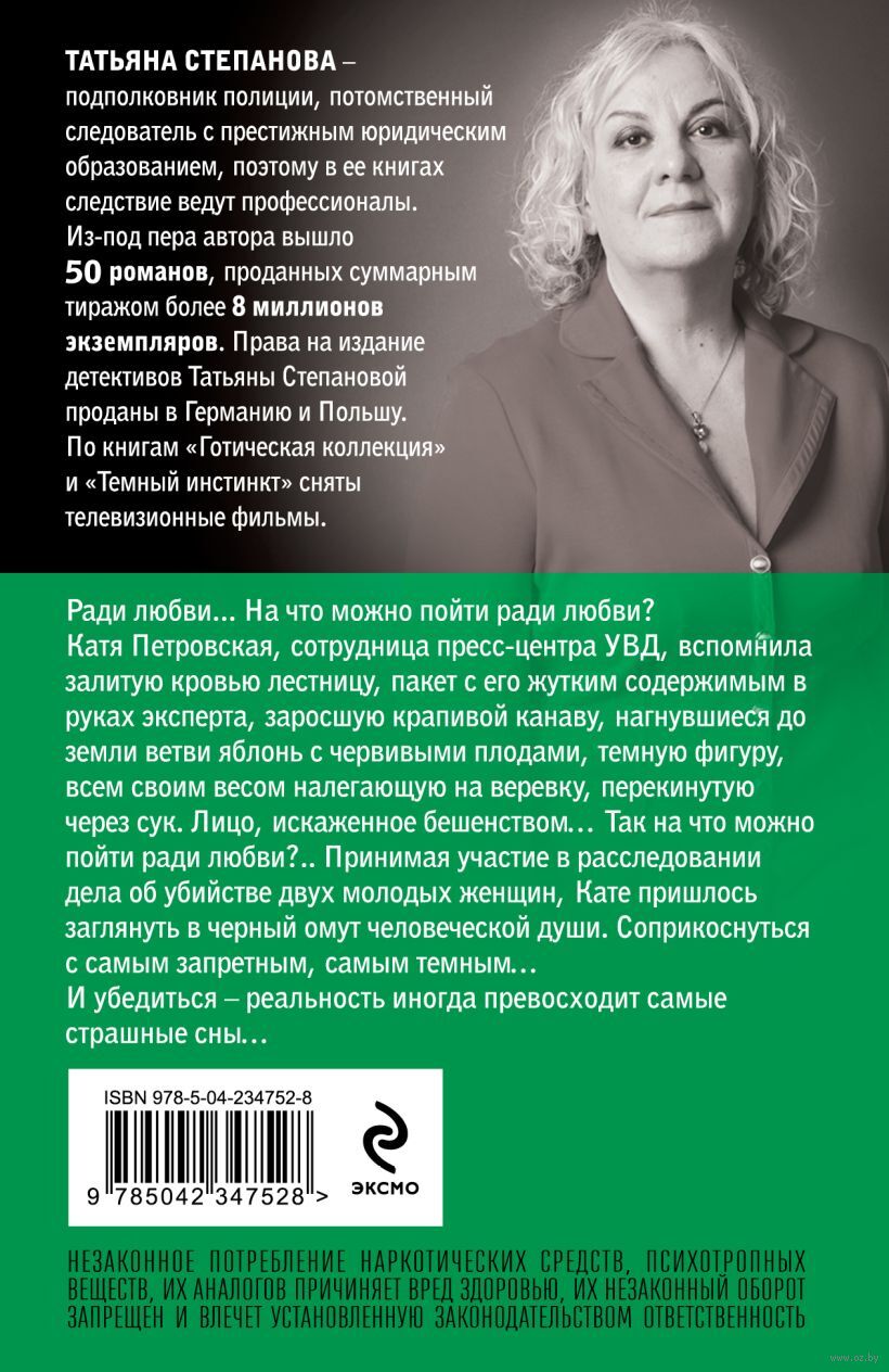 Ради любви... На что можно пойти ради любви? Катя Петровская, сотрудница пресс-центра УВД, вспомнила залитую кровью лестницу, пакет с его жутким содержимым в руках эксперта, заросшую крапивой канаву, нагнувшиеся до земли ветви яблонь с червивыми плодами, темную фигуру, всем своим весом налегающую на веревку, перекинутую через сук. Лицо, искаженное бешенством… Так, на что можно пойти ради любви?.. Принимая участие в расследовании дела об убийстве двух молодых женщин, Кате пришлось заглянуть в черный омут человеческой души. Соприкоснуться с самым запретным, самым темным… И убедиться – реальность иногда превосходят самые страшные сны…