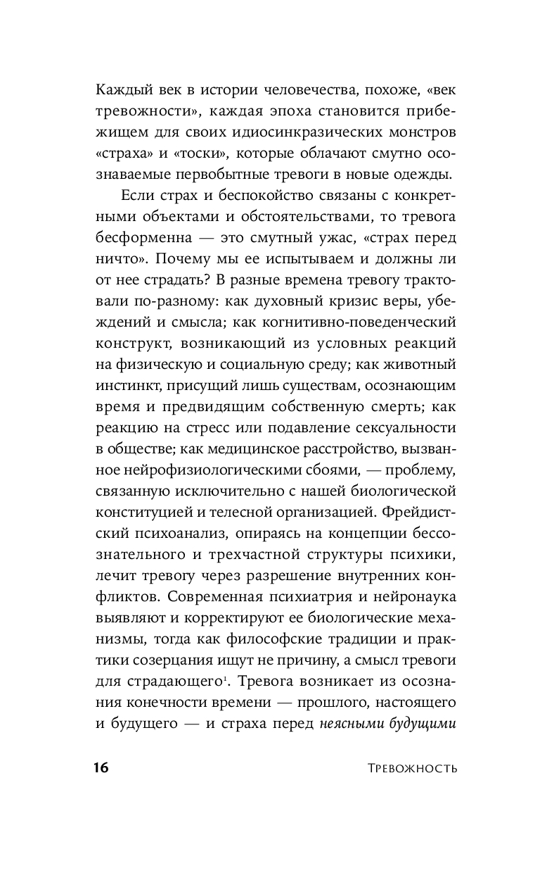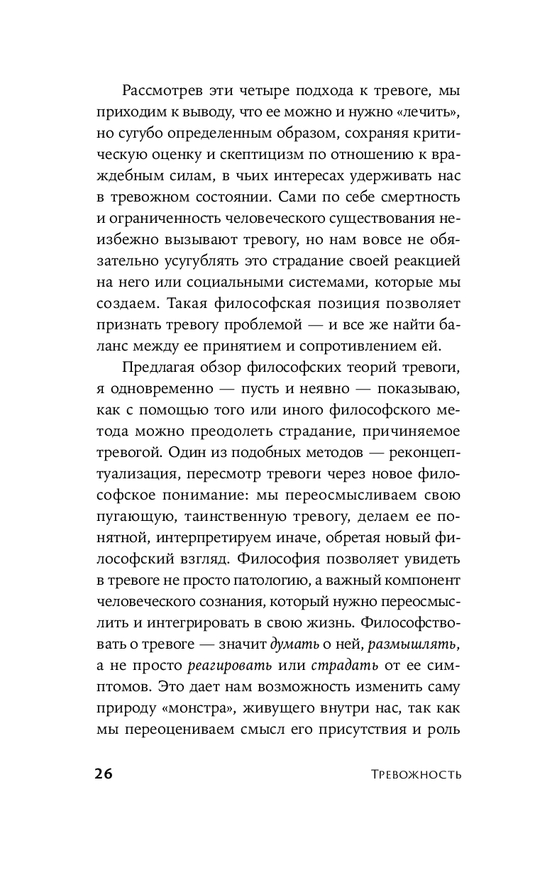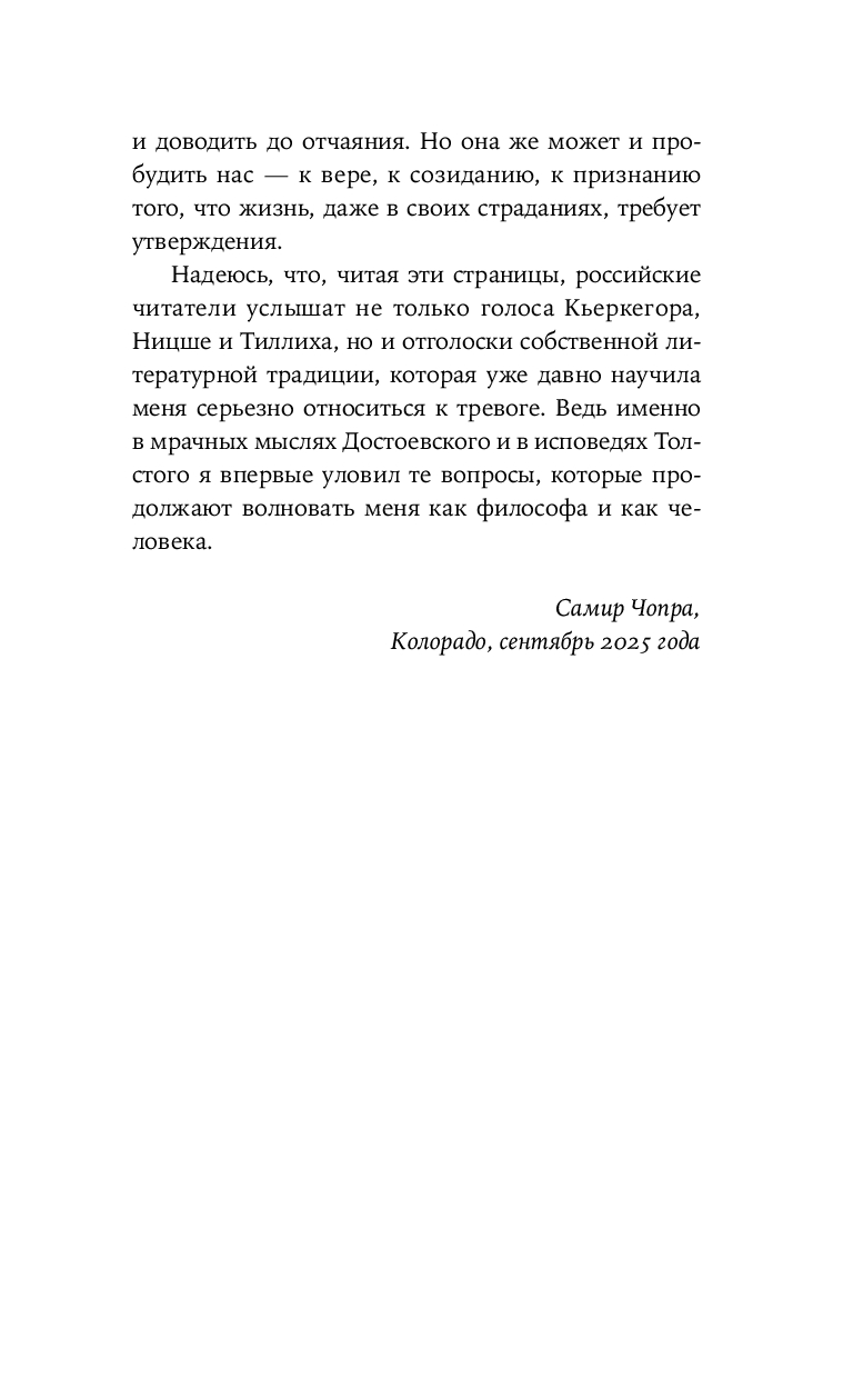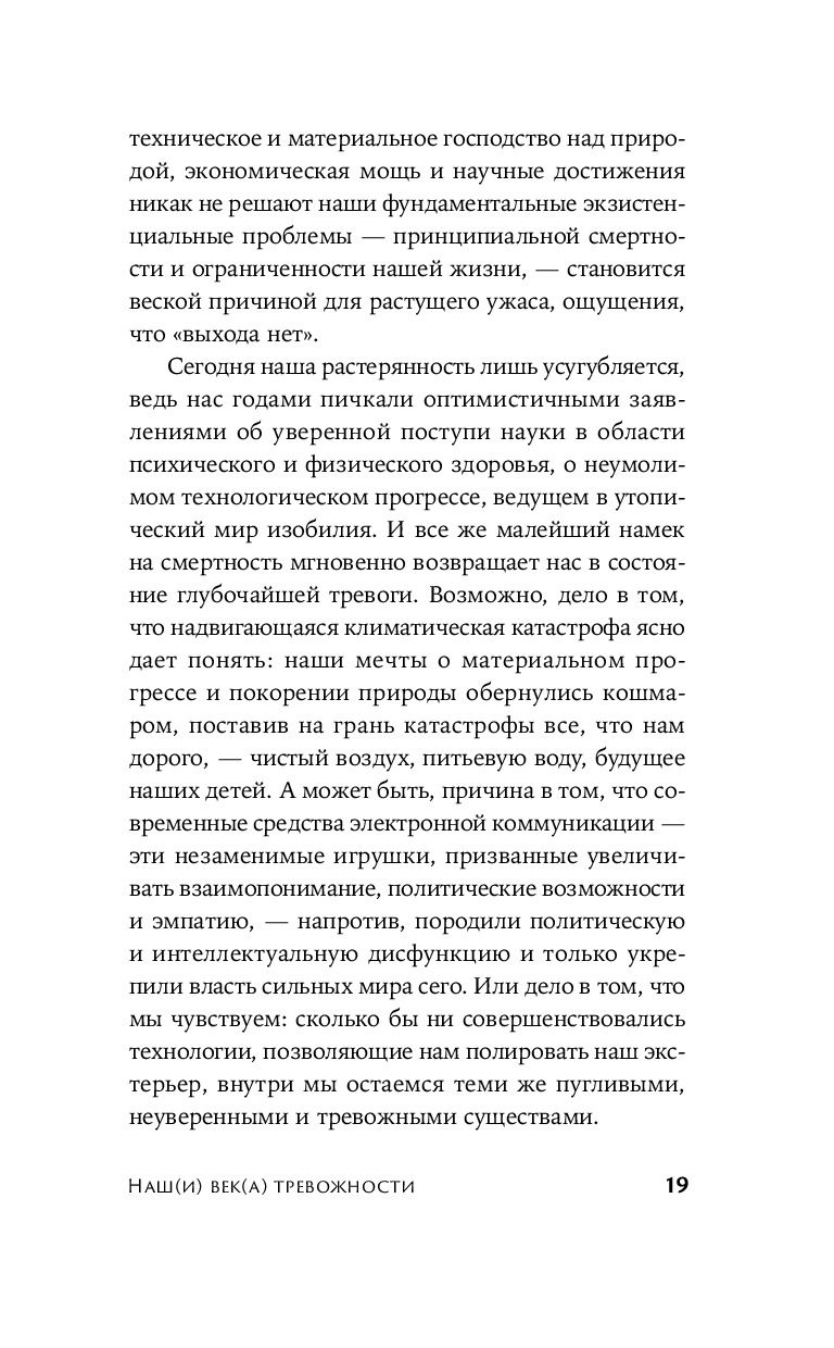 Среди всего многообразия литературы о тревожности книга Самира Чопры занимает особое место. Признавая остроту проблемы в современном мире и обоснованность объявления нашего века веком тревожности, Чопра убедительно показывает: тревога – неотъемлемая часть нашей природы и не испытывать ее было бы просто противоестественно. Многие философы, включая Будду, Кьеркегора, Ницше, Фрейда и Хайдеггера, рассматривали тревогу как неизбежную реакцию человека на существование: быть – значит испытывать тревогу. Обращаясь к социальным теориям и реалиям, автор исследует, как материальные факторы усугубляют тревогу, и подчеркивает: ни богатство, ни власть, ни новейшие достижения не способны избавить от нее. Сочетая трогательный, откровенный рассказ о собственном опыте и научные знания, ученый показывает, как философское осмысление тревоги помогает поладить с ней, научиться с ней жить и обрести в ней союзника.