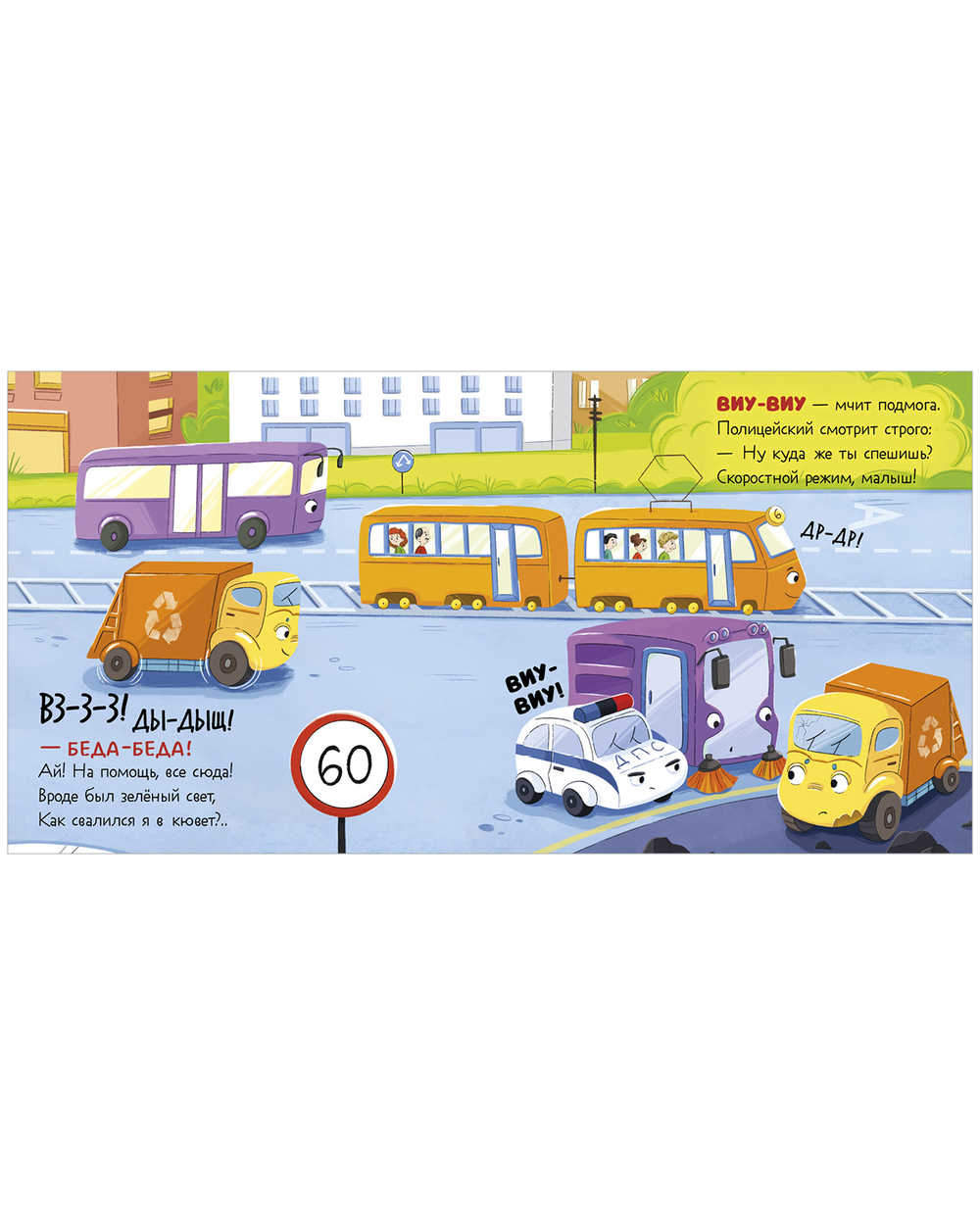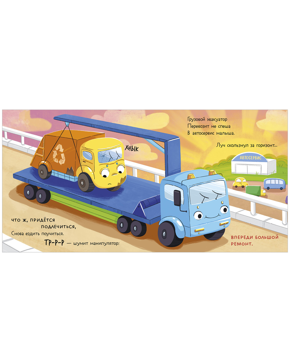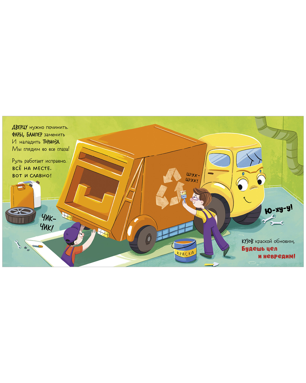 "Малыш мусоровоз едет на ремонт" – веселая история в стихах от Юлии Весовой с яркими сюжетными иллюстрациями.