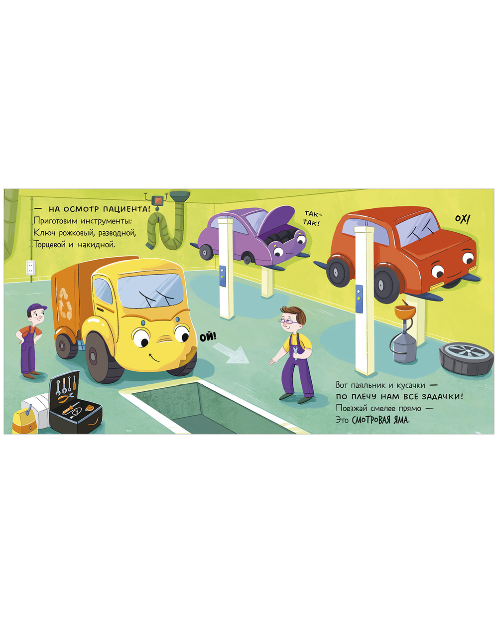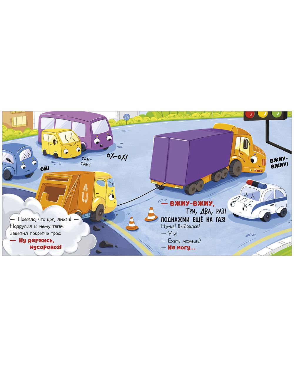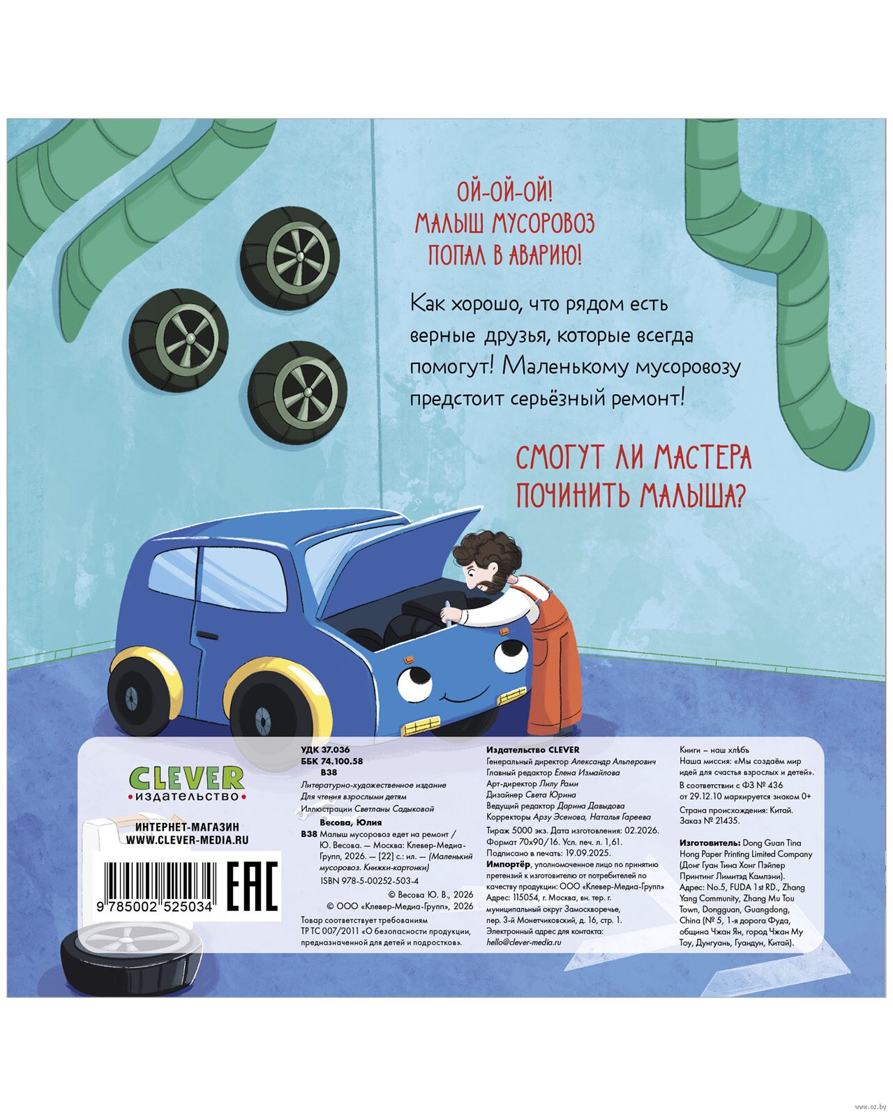 "Малыш мусоровоз едет на ремонт" – веселая история в стихах от Юлии Весовой с яркими сюжетными иллюстрациями.