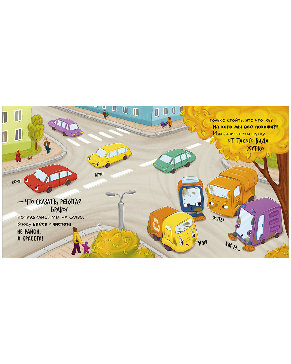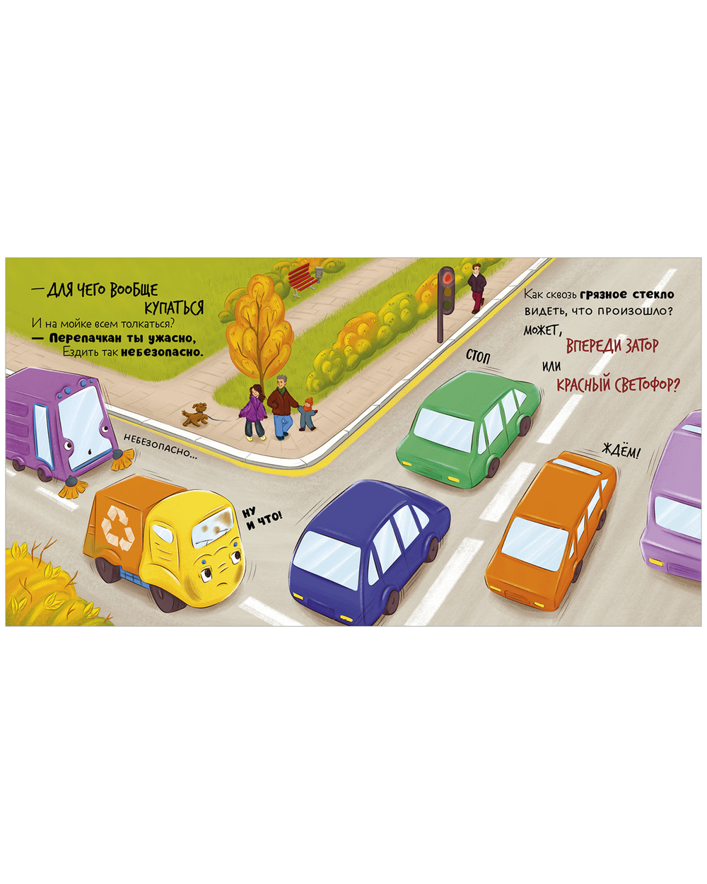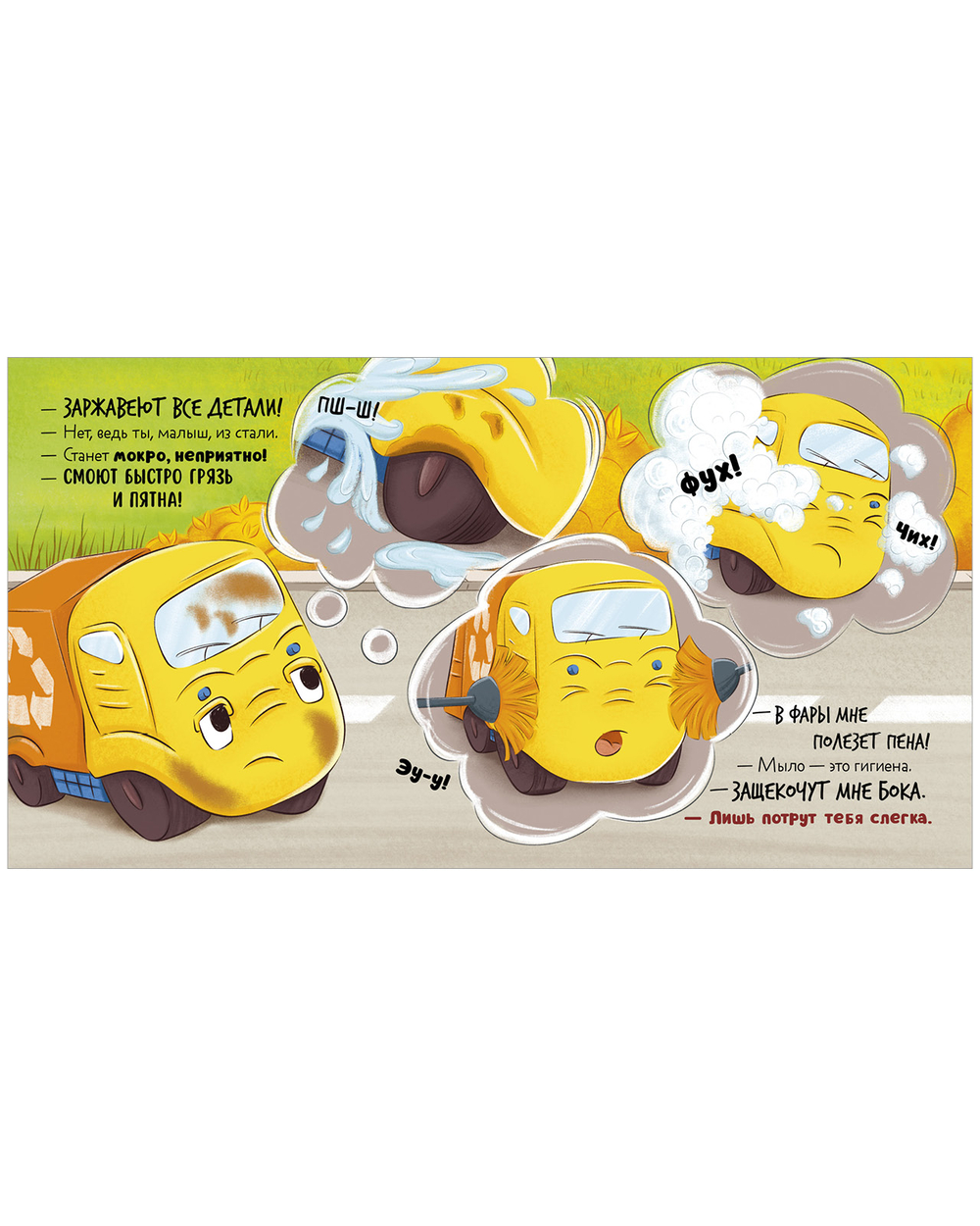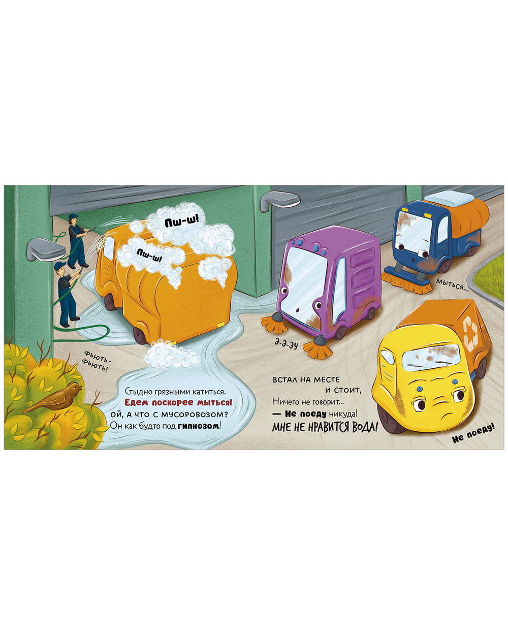 Мусоровоз весь день трудился и сильно испачкался. Друзья зовут его на мойку, но малыш переживает – вдруг, когда ему будут тереть бока, в фары полезет пена или станет щекотно. Он едет на стоянку, но вот незадача – грязнулю не пускают в гараж. Неужели все-таки придется помыться?