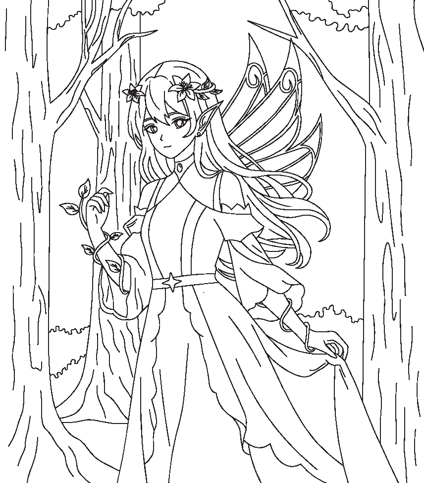 Утонченная раскраска с феями весеннего леса для поклонников тематики фэнтези и азиатского стиля рисования.