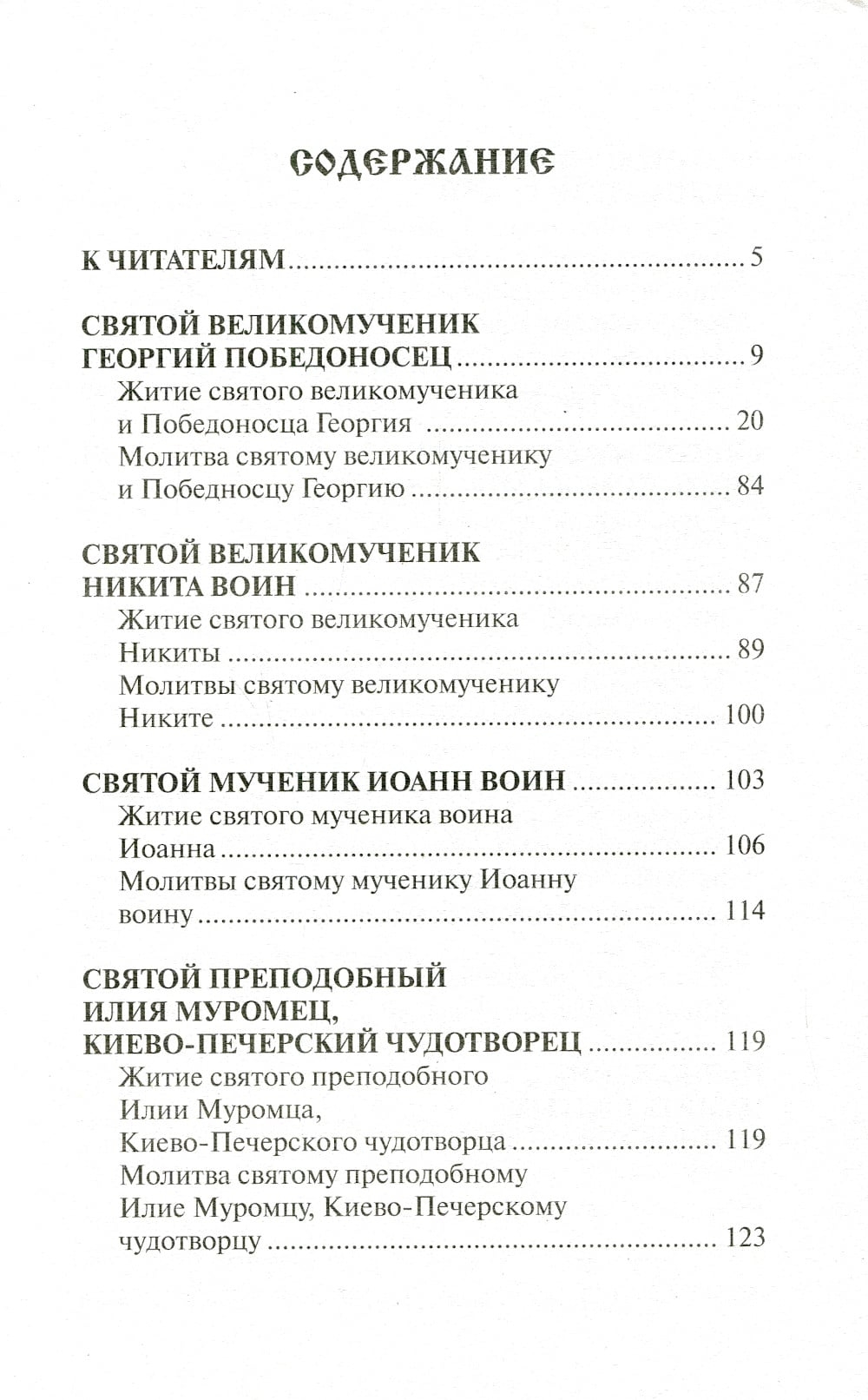 "Святые покровители мужчин". В книге рассказывается о семи великих подвижниках Православия, память которых чтят все верующие люди. В книге жития, случаи помощи по молитвам, молитвы: святому великомученику и Победоносцу Герогию, святому великомученику Никите воину, святому мученику Иоанну воину, святому преподобному Илие Муромцу, Киево-Печерскому чудотворцу, святому благоверному великому князю и воину Александру Невскому, святому благоверному князю Даниилу Московскому, святому воину Феодору Ушакову.