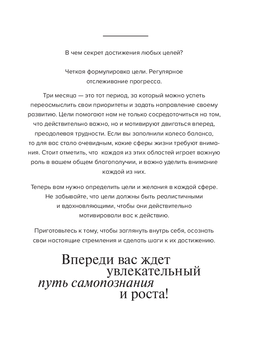 Дневник рассчитан на 3 месяца, на разворотах представлены мотивирующие цитаты, а удобный формат позволит везде брать его с собой.