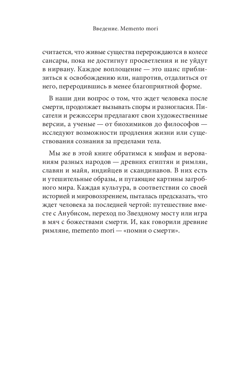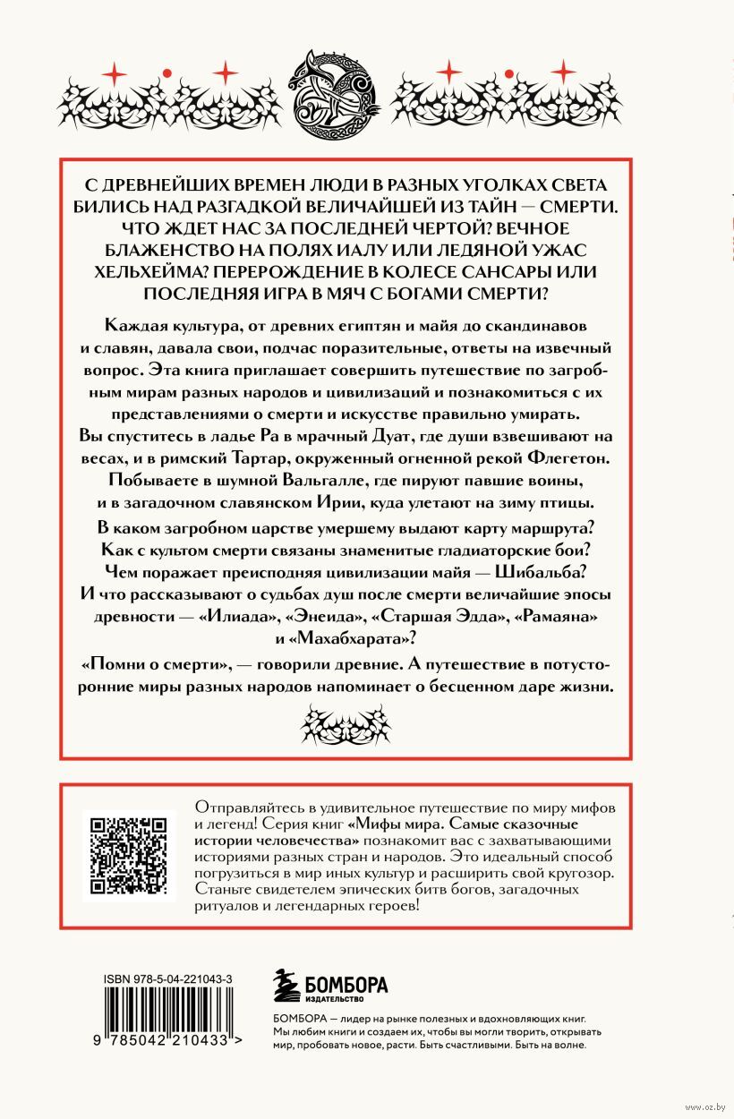 Эта яркая книга приглашает заглянуть в загробные миры разных народов: древних римлян и египтян, скандинавов, восточных славян, индийцев, майя – и познакомиться с их культурой смерти и искусством правильно умирать. Вы узнаете, какая незавидная судьба ожидает проигравшего суд Осириса, как Баба Яга и Кощей Бессмертный связаны с культом смерти у славян, что едят в скандинавской Вальгалле и как выглядит Хельхейм – мрачный приют для душ, которым повезло меньше. Кто в индуизме решает, кем переродится душа в следующей жизни? Как понять, что приближается Рагнарёк – конец мира? Чем удивляют древнеримские похороны и почему римляне боялись лемуров? Об этом и многом другом вы узнаете из этой книги, а цветные и черно-белые иллюстрации дополнят дантовское путешествие по загробным мирам человечества!