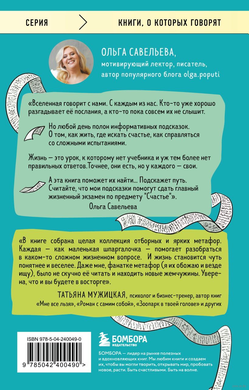В новой книге Ольга с радостью делится с читателями теми жизненными ребусами, которые разгадала сама. Для этого она выбрала самые яркие, самые наглядные метафоры. Те, которые точно заставят задуматься и непременно помогут разгадать самые сложные жизненные задачи.