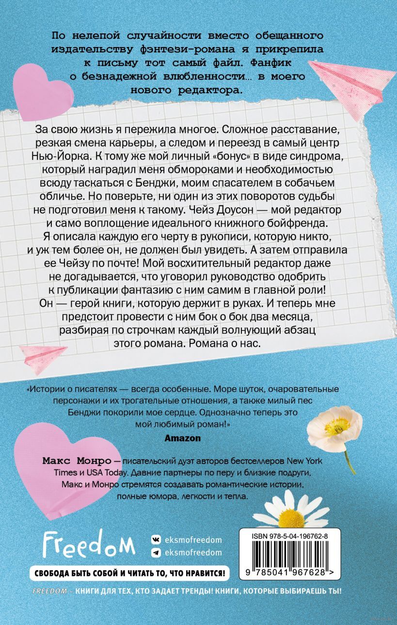 За свою не такую долгую жизнь я пережила многое. За моими плечами сложное расставание, резкая смена карьеры, а следом и переезд из захолустного городка в самый центр Нью-Йорка. К тому же мой личный "бонус" в виде синдрома, который щедро наградил меня периодическими обмороками и необходимостью всюду таскаться с Бенджи, моим очаровательным спасателем в собачьем обличье. Но поверьте, ни один из этих поворотов судьбы не подготовил меня к нему. Чейз Доусон – мой редактор. Пронзительные голубые глаза, мускулатура, от которой перехватывает дыхание, и идеальные темные волосы. Прибавьте к этому отличное чувство юмора и невероятный интеллект… Чейз – воплощение идеального книжного бойфренда. И да, я знаю, о чем говорю, ведь только что описала каждую его черту в пылающих подробностях в рукописи, которую никто, и уж тем более он, не должен был увидеть. А я только что отправила ее Чейзу по почте! Что еще хуже? Мой восхитительный редактор даже не догадывается, что уговорил руководство одобрить к публикации чужую фантазию с ним самим в главной роли! Он – герой книги, которую держит в своих руках. И теперь мне предстоит провести с ним два месяца в тесном кабинете, исправляя, переписывая и разбирая по строчкам каждый волнующий абзац этого романа. Романа о нас.