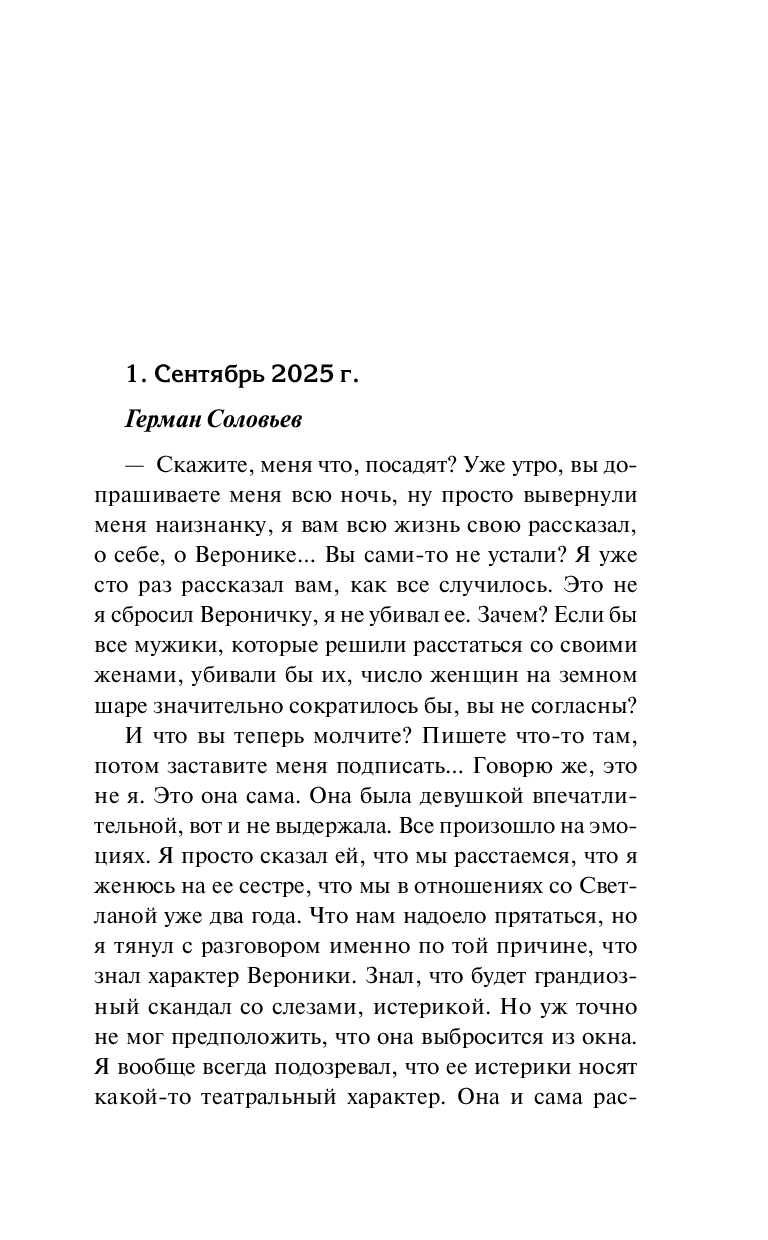 Герман Соловьев утверждает, что не убивал свою жену: да, он хотел с ней развестись, но не мог вытолкнуть ее из окна, Вероника прыгнула сама. На следующее утро на том же месте находят тело другой девушки, которая на первый взгляд никак не связана с Вероникой.